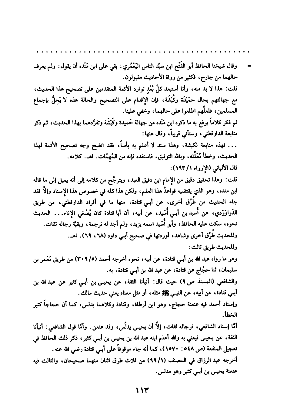 قلت: وهذا تحقيق دقيق من الإمام ابن دقيق العبد، ويترجَّح من كلامه إلى أنه يميل إلى ما قاله ابن منده، وهو الذي يقتضيه قواعدُ هذا العلم، ولكن هذا كله في خصوص هذا الإسناد والاّ فقد جاء الحديث من طُرُق أخرى، عن ابي قتادة، منها ما في أفراد الدارقطني، من طريق الدَراوَرْدي، عن أُسيد بن أبي أُسَيد، عن أبيه، أن أبا قتادة كان يُصْغي الإناء. . . الحديث نحوه، سكت عليه الحافظ، وأبو أُسَيد اسمه يزيد، ولم أجد له ترجمة، وبقيَّة رجاله ثقات.