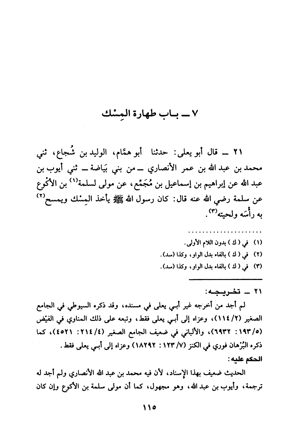 21 - قَالَ أَبُو يَعْلَى: حَدَّثَنَا أَبُو هَمَّامٍ، الْوَلِيدُ بْنُ شُجَاعٍ، ثَنِي مُحَمَّدُ بْنُ عَبْدِ اللَّهِ بْنِ عُمَرَ الْأَنْصَارِيُّ - مِنْ بَنِي بَيَاضَةَ - ثَنِي أَيُّوبُ بْنُ عَبْدِ اللَّهِ عَنْ إِبْرَاهِيمَ بْنِ إِسْمَاعِيلَ بْنِ مُجَمِّعٍ، عَنْ مَوْلًى لِسَلَمَةَ بْنِ الْأَكْوَعِ عَنْ سَلَمَةَ رَضِيَ اللَّهُ عَنْهُ قَالَ: كَانَ رَسُولُ اللَّهِ صَلَّى اللَّهُ عَلَيْهِ وَسَلَّمَ §يَأْخُذُ الْمِسْكَ وَيَمْسَحُ بِهِ رَأْسَهُ وَلِحْيَتَهُ