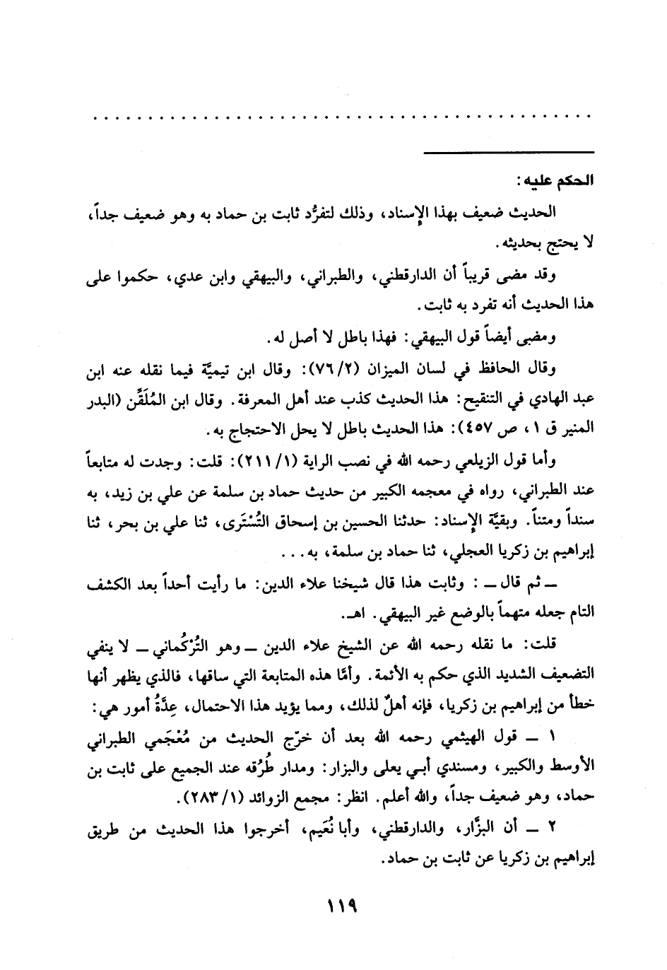 وقال الحافظ في لسان الميزان (2/ 76): وقال ابن تيميَّه فيما نقله عنه ابن عبد الهادي في التنقيح: هذا الحديث كذب عند أهل المعرفة. وقال ابن المُلَقِّن (البدر المنير ق 1، ص 457): هذا الحديث باطل لا يحل الاحتجاج به.
