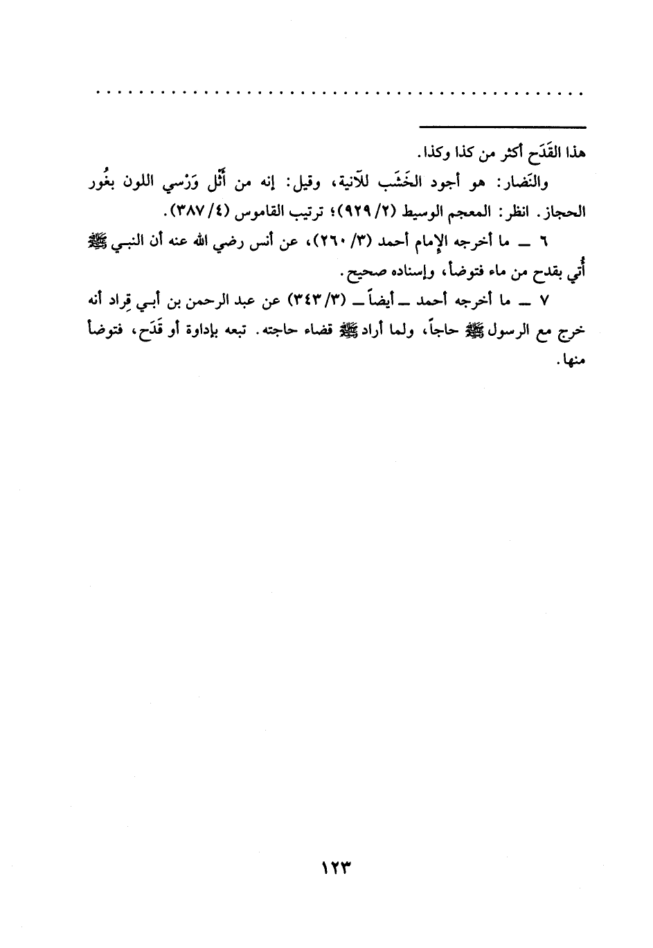 7 - ما أخرجه أحمد -أيضًا- (3/ 343) عن عبد الرحمن بن أبي قِراد أنه خرج مع الرسول - صلى الله عليه وسلم - حاجًا، ولما أراد - صلى الله عليه وسلم - قضاء حاجته. تبعه بإداوة أو قَدَح، فتوضأ منها.