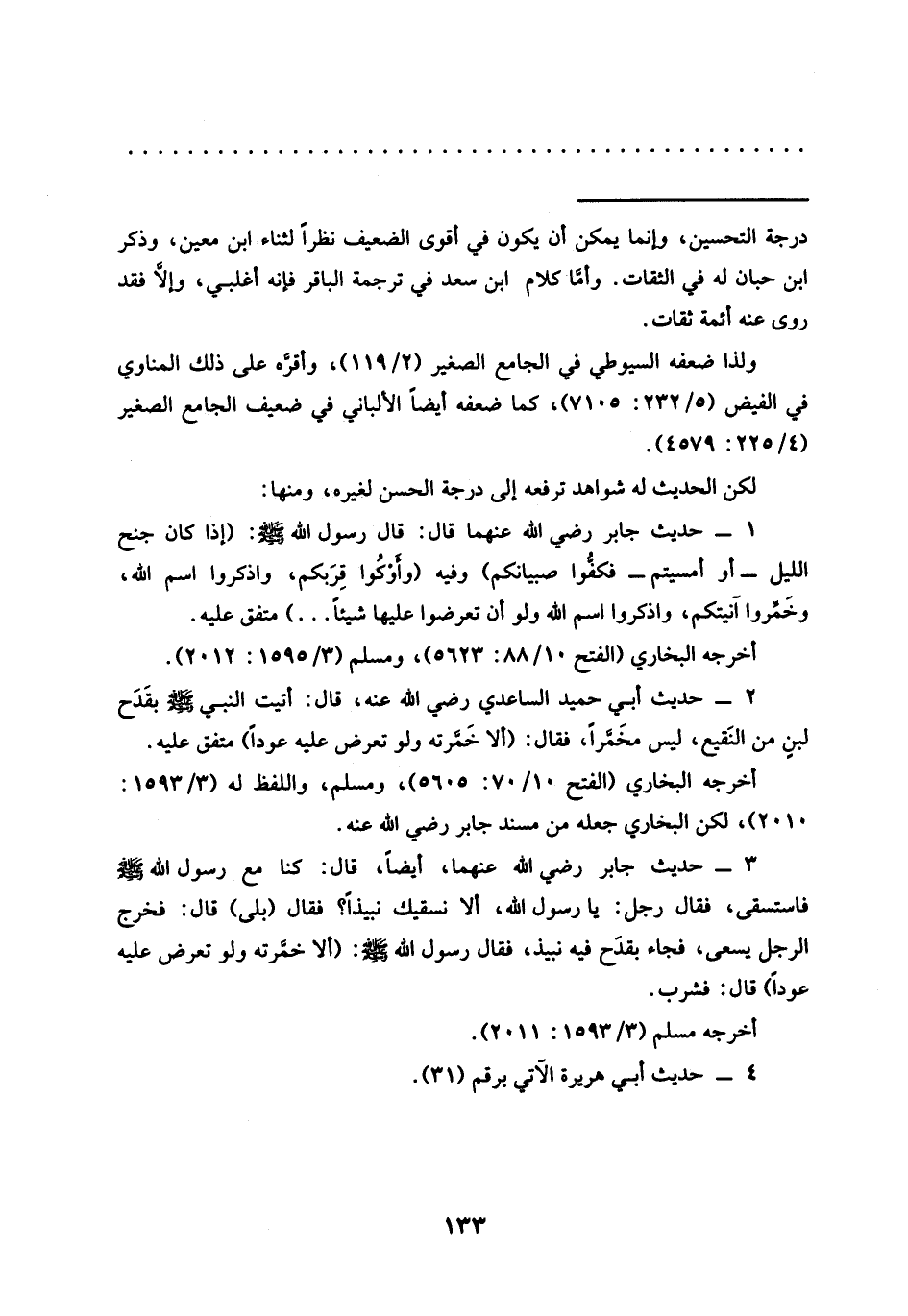 1 - حديث جابر رضي الله عنهما قَالَ: قَالَ رَسُولُ اللَّهِ - صَلَّى اللَّهُ عَلَيْهِ وسلم -: (إذا كان جنح الليل -أو أمسيتم- فكفُّوا صبيانكم) وفيه (وأوْكُوا قِرَبكم، واذكروا اسم الله، وخَمِّروا آنيتكم، واذكروا اسم الله ولو أن تعرضوا عليها شيئًا ...) متفق عليه.