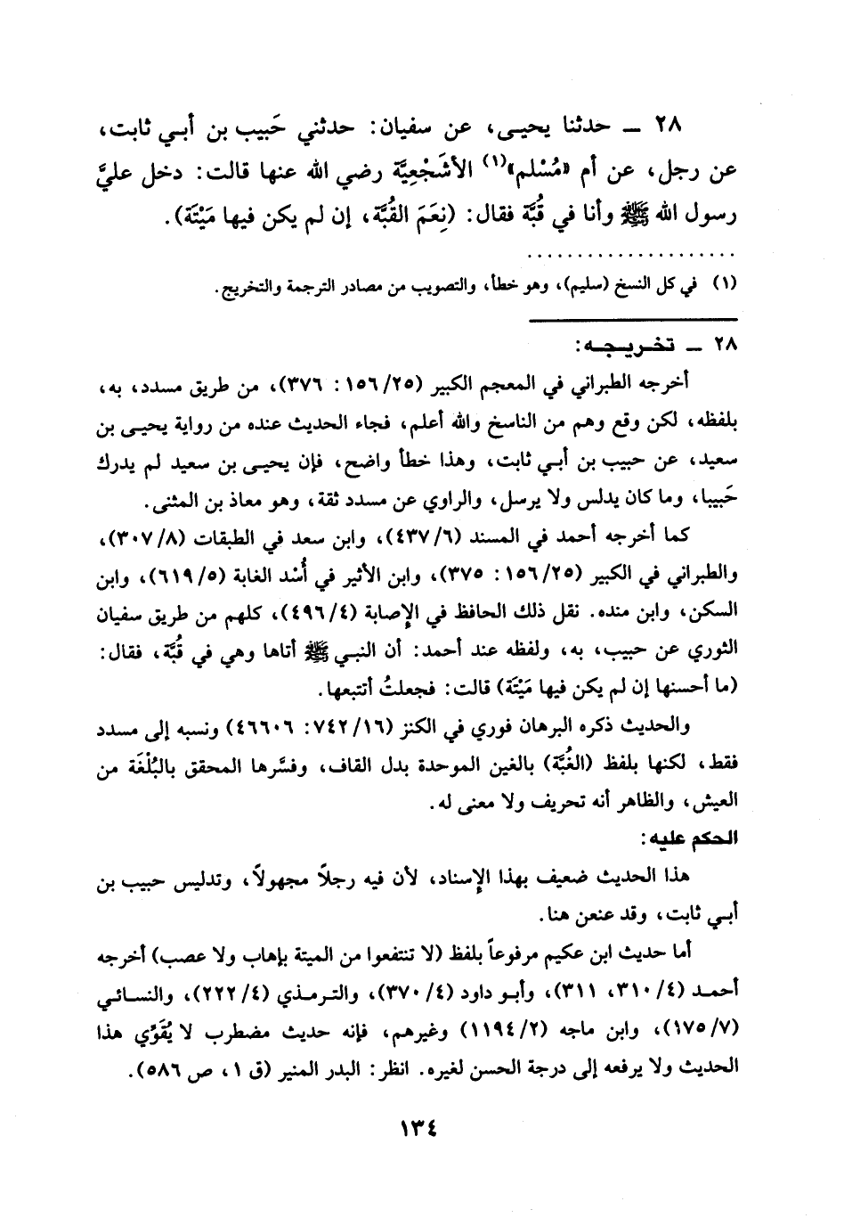 حَدَّثَنِي حَبِيبُ بْنُ أَبِي ثَابِتٍ، عَنْ رَجُلٍ، عَنْ أُمِّ " مُسْلِمٍ " الْأَشْجَعِيَّةِ رضي الله عَنْهَا قَالَتْ: دَخَلَ عَلَيَّ رَسُولُ اللَّهِ صَلَّى اللَّهُ عَلَيْهِ وَسَلَّمَ وَأَنَا فِي قُبَّةٍ فَقَالَ: (§نِعْمَ الْقُبَّةُ، إِنْ لَمْ يَكُنْ فِيهَا مَيْتَةٌ)