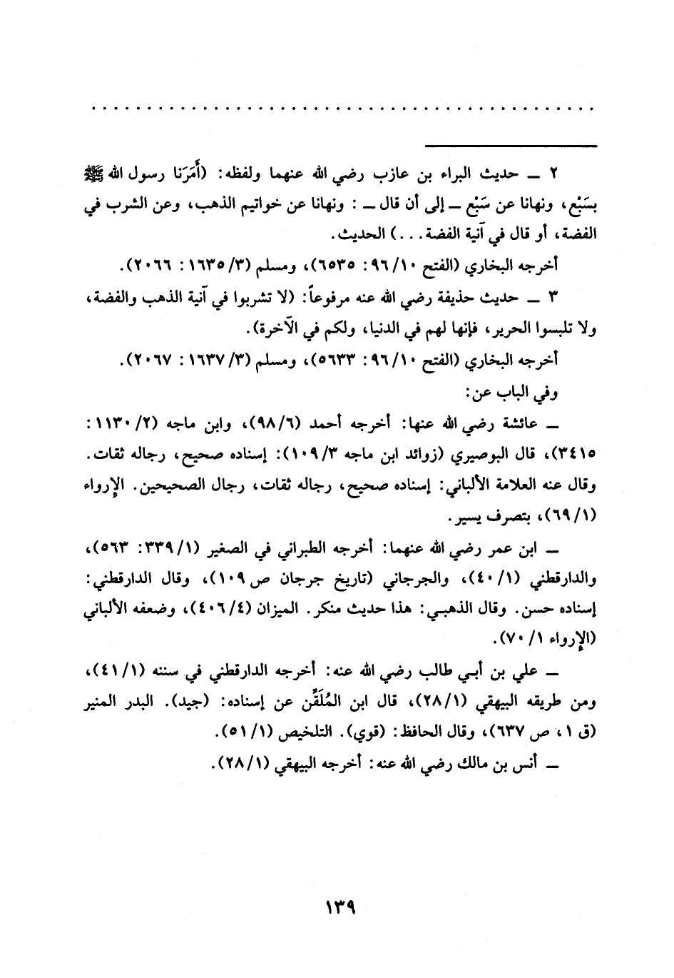 = 2 - حَدِيثِ الْبَرَاءِ بْنِ عَازِبٍ رَضِيَ اللَّهُ عَنْهُما ولفظه: (أمَرَنا رَسُولُ اللَّهِ - صَلَّى اللَّهُ عَلَيْهِ وَسَلَّمَ - بسَبْع، ونهانا عن سَبْع -إلى أن قال-: ونهانا عن خواتيم الذهب، وعن الشرب في الفضة، أو قال في آنية الفضة. . .) الحديث.