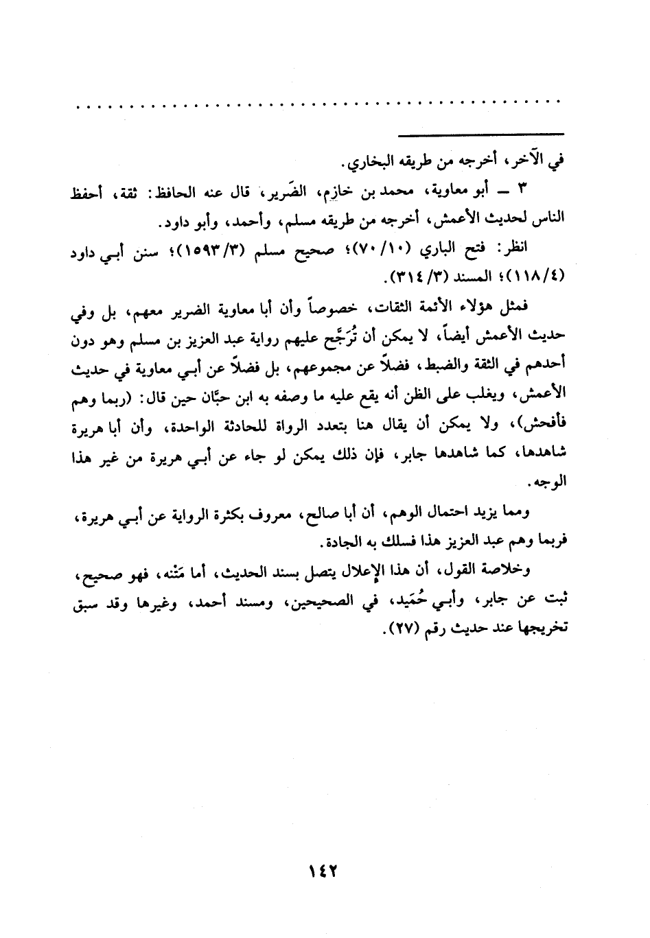 فمثل هؤلاء الأئمة الثقات، خصوصًا وأن أبا معاوية الضرير معهم، بل وفي حديث الأعمش أيضًا، لا يمكن أن تُرَجَّح عليهم رواية عبد العزيز بن مسلم وهو دون أحدهم في الثقة والضبط، فضلًا عن مجموعهم، بل فضلًا عن أبي معاوية في حديث الأعمش، ويغلب على الظن أنه يقع عليه ما وصفه به ابن حبَّان حين قال: (ربما وهم فأفحش)، ولا يمكن أن يقال هنا بتعدد الرواة للحادثة الواحدة، وأن أبا هريرة شاهدها، كما شاهدها جابر، فإن ذلك يمكن لو جاء عن أبي هريرة من غير هذا الوجه.