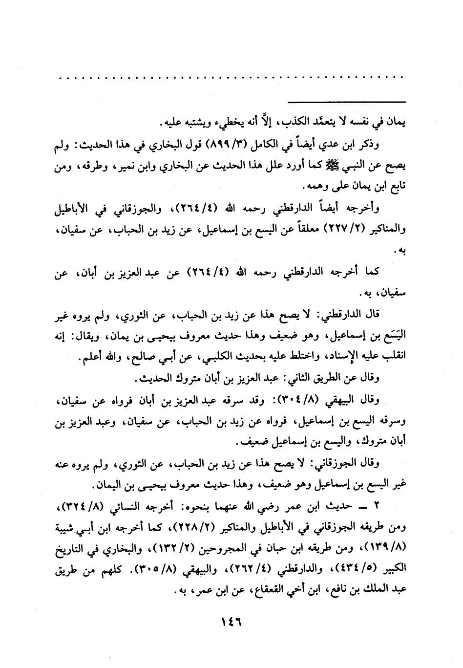 وأخرجه أيضًا الدارقطني رحمه الله (4/ 264)، والجوزقاني في الأباطيل والمناكير (2/ 227) معلقًا عن اليسع بن إسماعيل، عن زيد بن الحباب، عن سفيان، به كما أخرجه الدارقطني رحمه الله (4/ 264) عن عبد العزيز بن أبان، عن سفيان، به.