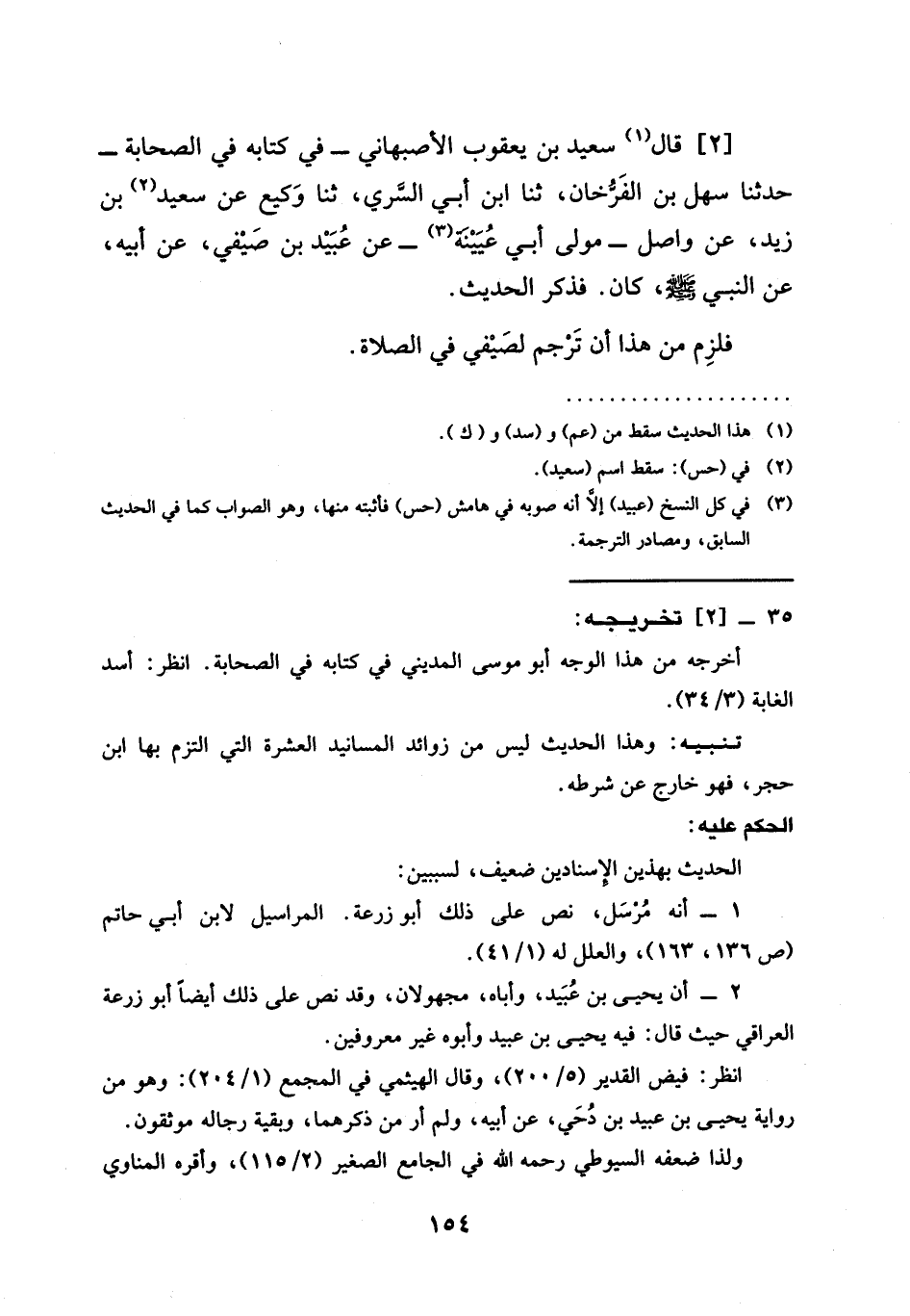 [2] قال (¬1) سَعِيدُ بْنُ يَعْقُوبَ الْأَصْبَهَانِيُّ -فِي كِتَابِهِ فِي الصَّحَابَةِ- حَدَّثَنَا سَهْلُ بْنُ الفَرُّخان، ثنا ابْنُ أَبِي السَّري، ثنا وَكيع عَنِ سَعِيدِ (¬2) بْنِ زَيْدٍ، عَنْ وَاصِلٍ -مَوْلَى أَبِي عُيَيْنه (¬3) - عَنْ عُبَيْد بْنِ صَيْفي، عَنْ أَبِيهِ، عَنِ النَّبِيِّ - صَلَّى اللَّهُ عَلَيْهِ وَسَلَّمَ -، كَانَ. فَذَكَرَ الْحَدِيثَ.