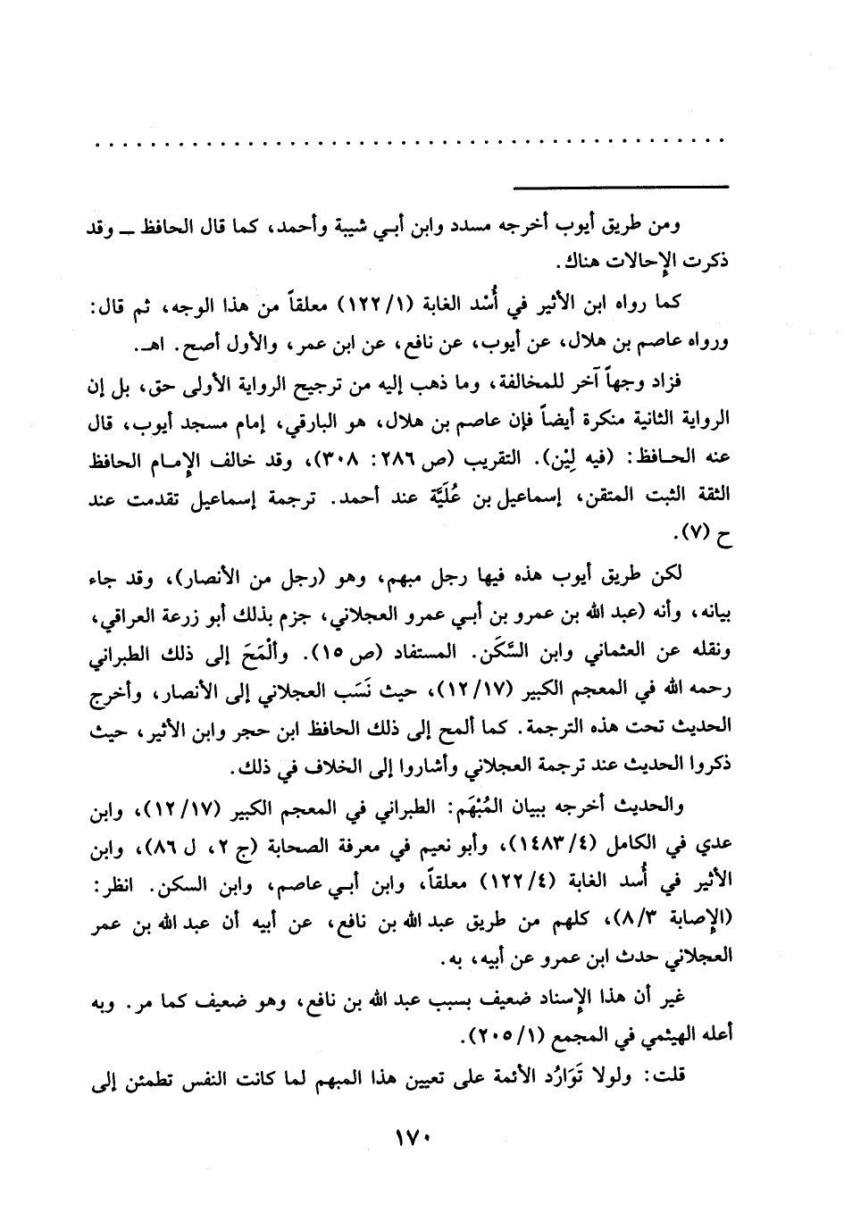 لكن طريق أيوب هذه فيها رجل مبهم، وهو (رجل من الأنصار)، وقد جاء بيانه، وأنه (عبد الله بن عمرو بن أبي عمرو العجلاني، جزم بذلك أبو زرعة العراقي، ونقله عن العثماني وابن السَّكَن. المستفاد (ص 15). وألْمَحَ إلى ذلك الطبراني رحمه الله في المعجم الكبير (17/ 12)، حيث نَسَب العجلاني إلى الأنصار، وأخرج الحديث تحت هذه الترجمة. كما ألمح إلى ذلك الحافظ ابن حجر وابن الأثير، حيث ذكروا الحديث عند ترجمة العجلاني وأشاروا إلى الخلاف في ذلك.
