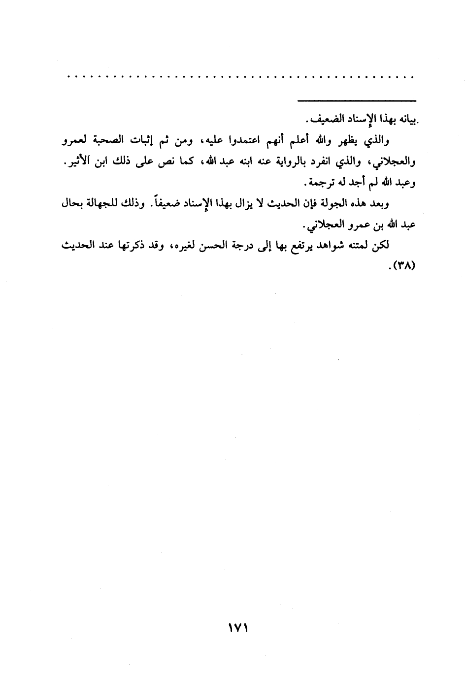 وبعد هذه الجولة فإن الحديث لا يزال بهذا الإسناد ضعيفًا. وذلك للجهالة بحال عبد الله بن عمرو العجلاني.