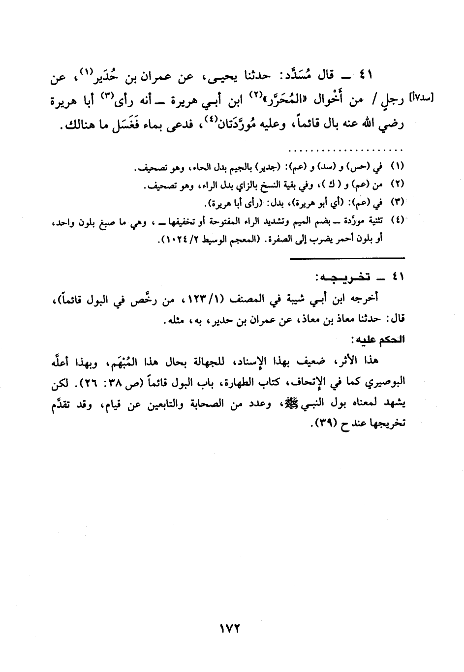 حَدَّثَنَا يَحْيَى، عَنْ عِمْرَانَ بْنِ حُدَيْرٍ، عَنْ رَجُلٍ / مِنْ أَخْوَالِ " الْمُحَرَّرِ " ابن أَبِي هُرَيْرَةَ - أَنَّهُ رَأَى أَبَا هريرة رضي الله عَنْهُ §بَالَ قَائِمًا، وعليه مُورَّدَتان، فدعى بِمَاءٍ فَغَسَلَ مَا هُنَالِكَ