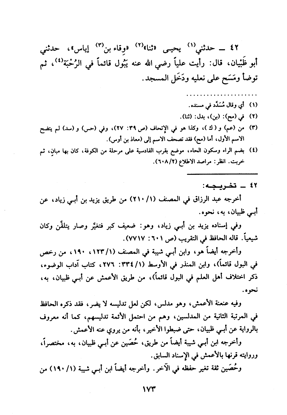 42 - حَدَّثَنِي يَحْيَى " ثنا " " وقَاءُ بْنُ إِيَاسٍ "، حَدَّثَنِي أَبُو ظَبْيَانَ، قَالَ: §رَأَيْتُ عَلِيًّا رَضِيَ اللَّهُ عَنْهُ يَبُولُ قَائِمًا فِي الرَّحَبَةِ، ثُمَّ تَوَضَّأَ وَمَسَحَ عَلَى نَعْلَيْهِ وَدَخَلَ الْمَسْجِدَ