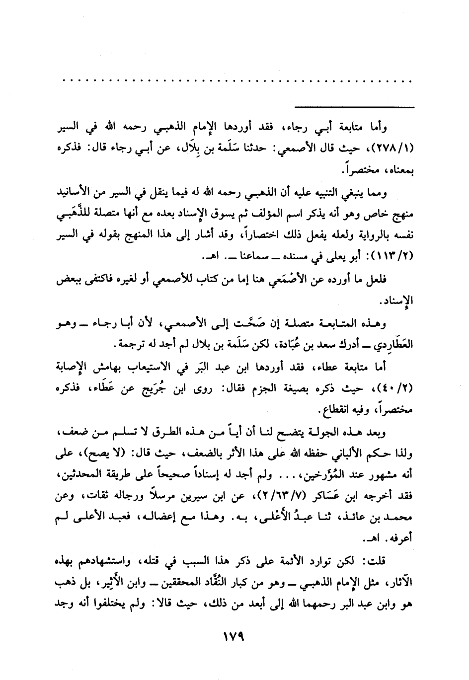= وأما متابعة أبي رجاء، فقد أوردها الإِمام الذهبي رحمه الله في السير (278/ 1)، حيث قال الأصمعي: حدثنا سَلَمة بن بِلًال، عن أبي رجاء قال: فذكره بمعناه، مختصرًا.