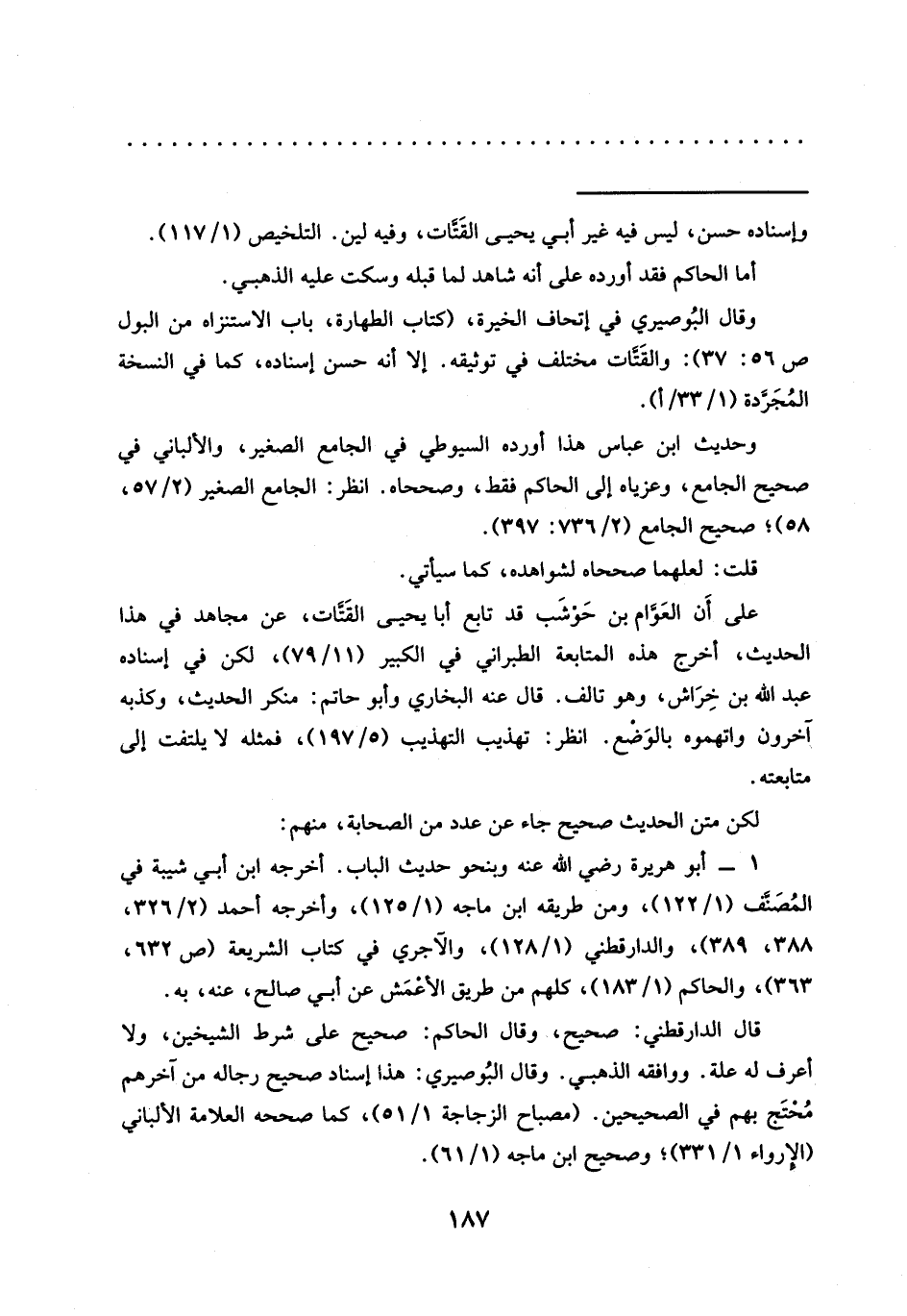 وقال البُوصيري في إتحاف الخيرة، (كتاب الطهارة، باب الاستنزاه من البول ص 56: 37): والقَتَّات مختلف في توثيقه. إلا أنه حسن إسناده، كما في النسخة المُجَرَّدة (1/ 33/ أ).