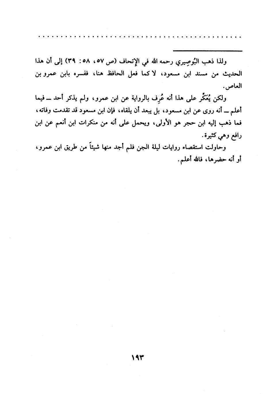 = ولذا ذهب البُوصِيري رحمه الله في الإتحاف (ص 57، 58: 39) إلى أن هذا الحديث من مسند ابن مسعود، لا كما فعل الحافظ هنا، ففسره بابن عمرو بن العاص.