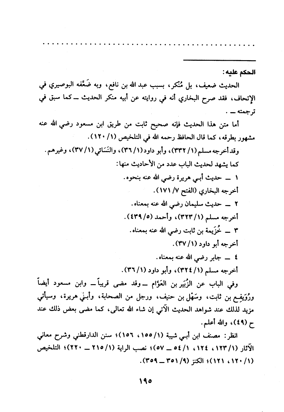انظر: مصنف ابن أبي شيبة (1/ 155، 156)؛ سنن الدارقطني وشرح معاني الآثار (1/ 123، 124، 1/ 54 - 57)؛ نصب الراية (1/ 215 - 220)؛ التلخيص (1/ 120، 121)؛ الكنز (9/ 351 - 359).