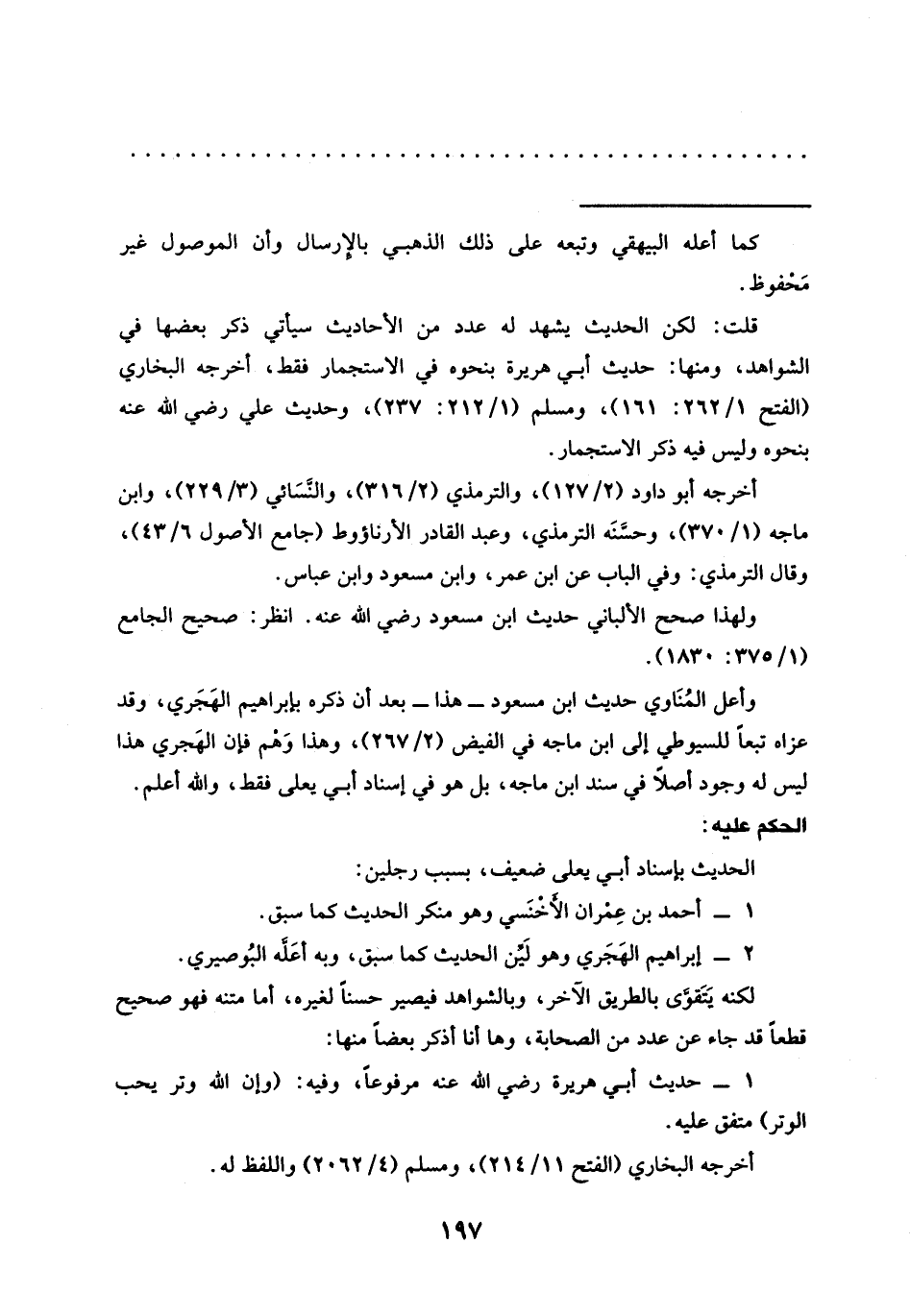 قلت: لكن الحديث يشهد له عدد من الأحاديث سيأتي ذكر بعضها في الشواهد، ومنها: حديث أبي هريرة بنحوه في الاستجمار فقط، أخرجه البخاري (الفتح 262/ 1: 161)، ومسلم (1/ 212: 237)، وحديث علي رضي الله عنه بنحوه وليس فيه ذكر الاستجمار.