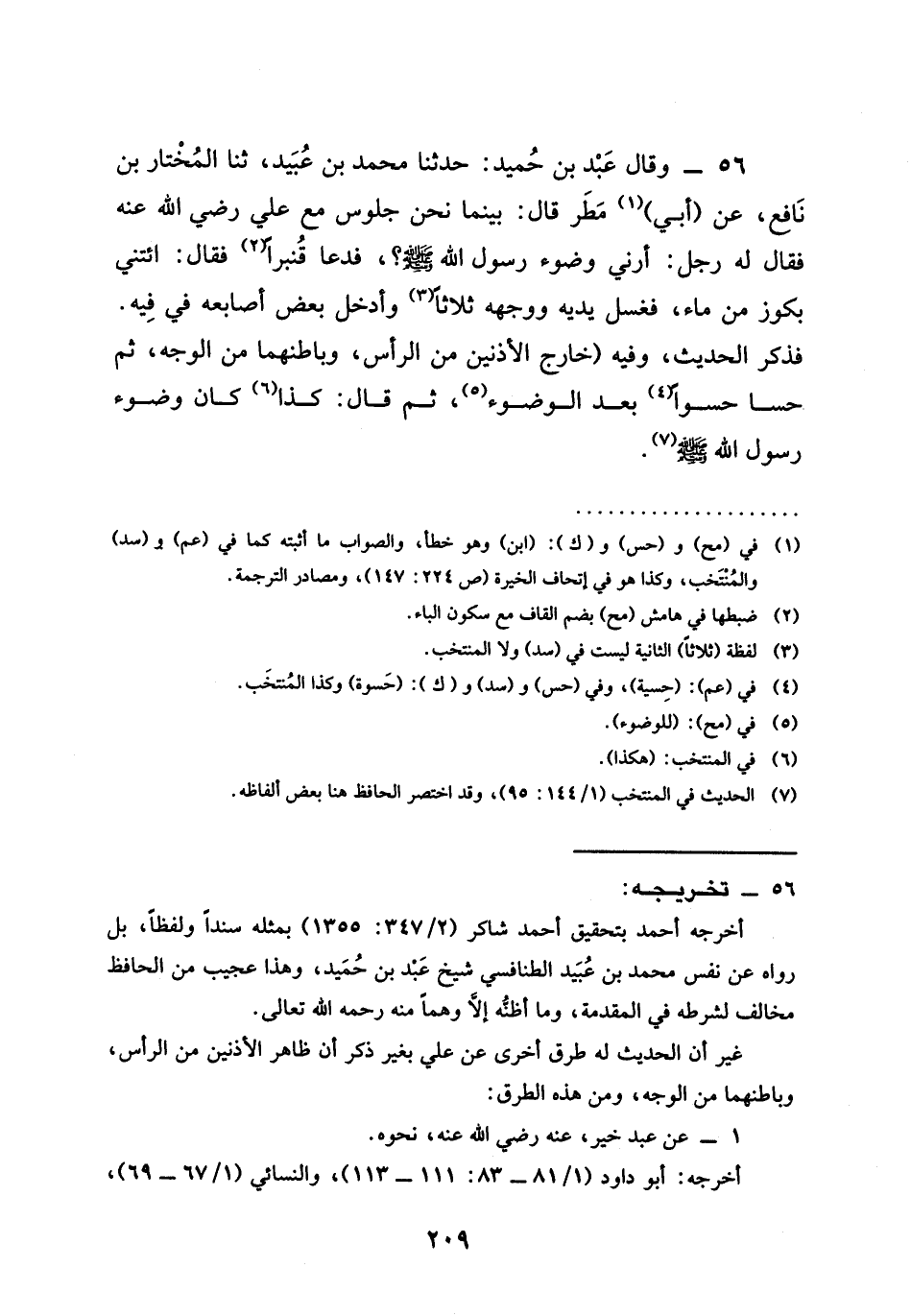 حَدَّثَنَا مُحَمَّدُ بْنُ عُبَيْدٍ، ثنا الْمُخْتَارُ بْنُ نَافِعٍ، عَنْ (أَبِي) مَطَرٍ قَالَ: بَيْنَمَا نَحْنُ جُلُوسٌ مَعَ عَلِيٍّ رَضِيَ اللَّهُ عَنْهُ فَقَالَ لَهُ رَجُلٌ: أَرِنِي وُضُوءَ رَسُولِ اللَّهِ صَلَّى اللَّهُ عَلَيْهِ وَسَلَّمَ، فَدَعَا قَنْبَرًا فَقَالَ: ائْتِنِي بِكُوزٍ مِنْ مَاءٍ، فَغَسَلَ يَدَيْهِ وَوَجْهَهُ ثَلَاثًا وَأَدْخَلَ بَعْضَ أَصَابِعِهِ فِي فِيهِ فَذَكَرَ الْحَدِيثَ، وَفِيهِ خَارِجَ الْأُذُنَيْنِ مِنَ الرَّأْسِ، وباطنهما مِنَ الْوَجْهِ، ثُمَّ حَسَا حَسْوًا بَعْدَ الْوُضُوءِ، ثُمَّ قَالَ: §كَذَا كَانَ وُضُوءُ رَسُولِ اللَّهِ صَلَّى اللَّهُ عَلَيْهِ وَسَلَّمَ
