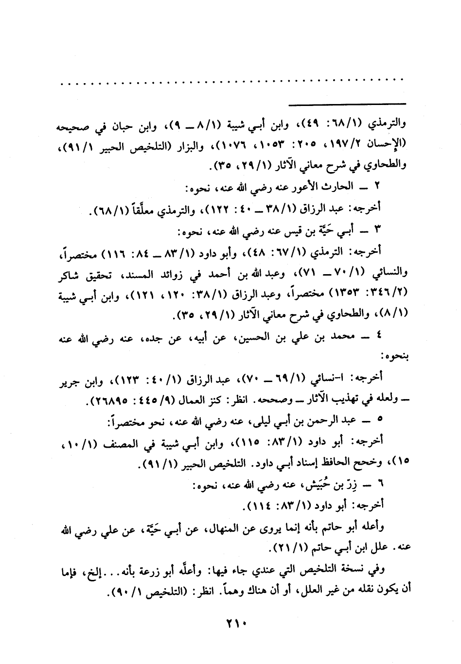5 - عبد الرحمن بن أبي ليلى، عنه رضي الله عنه، نحو مختصرًا: أخرجه: أبو داود (1/ 83: 115)، وابن أبي شيبة في المصنف (1/ 10، 15)، وصحح الحافظ إسناد أبي داود. التلخيص الحبير (1/ 91).