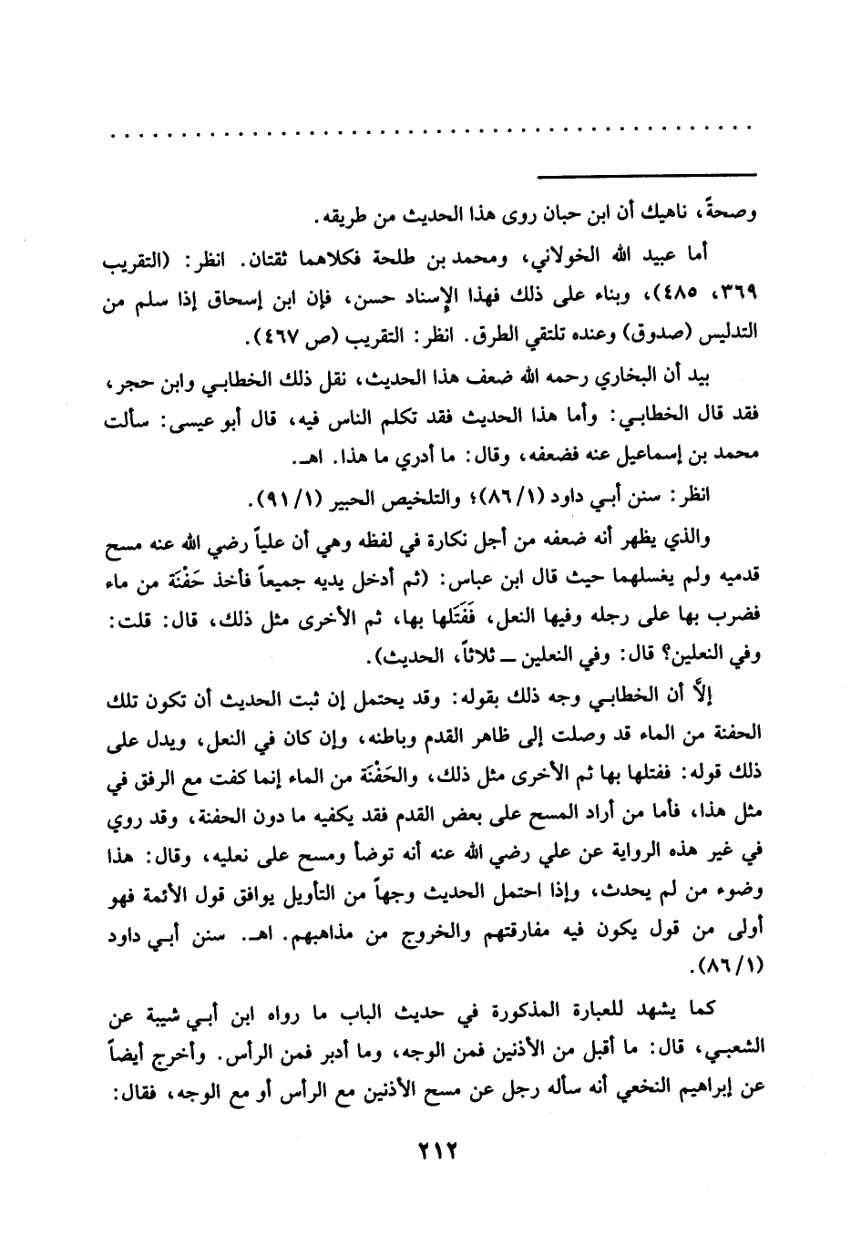 إلَّا أن الخطابي وجه ذلك بقوله: وقد يحتمل إن ثبت الحديث أن تكون تلك الحفنة من الماء قد وصلت إلى ظاهر القدم وباطنه، وإن كان في النعل، ويدل على ذلك قوله: ففتلها بها ثم الأخرى مثل ذلك، والحَفْنَة من الماء إنما كفت مع الرفق في مثل هذا، فأما من أراد المسح على بعض القدم فقد يكفيه ما دون الحفنة، وقد روي في غير هذه الرواية عن علي رضي الله عنه أنه توضأ ومسح على نعليه، وقال: هذا وضوء من لم يحدث، وإذا احتمل الحديث وجهًا من التأويل يوافق قول الأئمة فهو أولى من قول يكون فيه مفارقتهم والخروج من مذاهبهم. اهـ. سنن أبي داود (1/ 86).