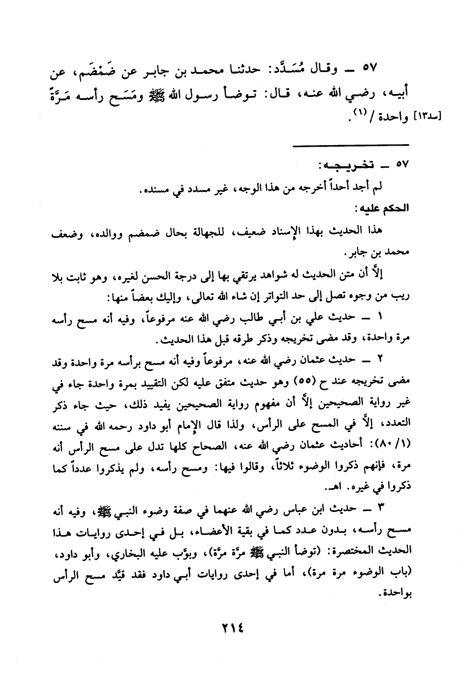 حَدَّثَنَا مُحَمَّدُ بْنُ جَابِرٍ عَنْ ضَمْضَمٍ، عَنْ أَبِيهِ، رَضِيَ اللَّهُ عَنْهُ، قَالَ: §تَوَضَّأَ رَسُولُ اللَّهِ صَلَّى اللَّهُ عَلَيْهِ وَسَلَّمَ وَمَسَحَ رَأْسَهُ مَرَّةً وَاحِدَةً /