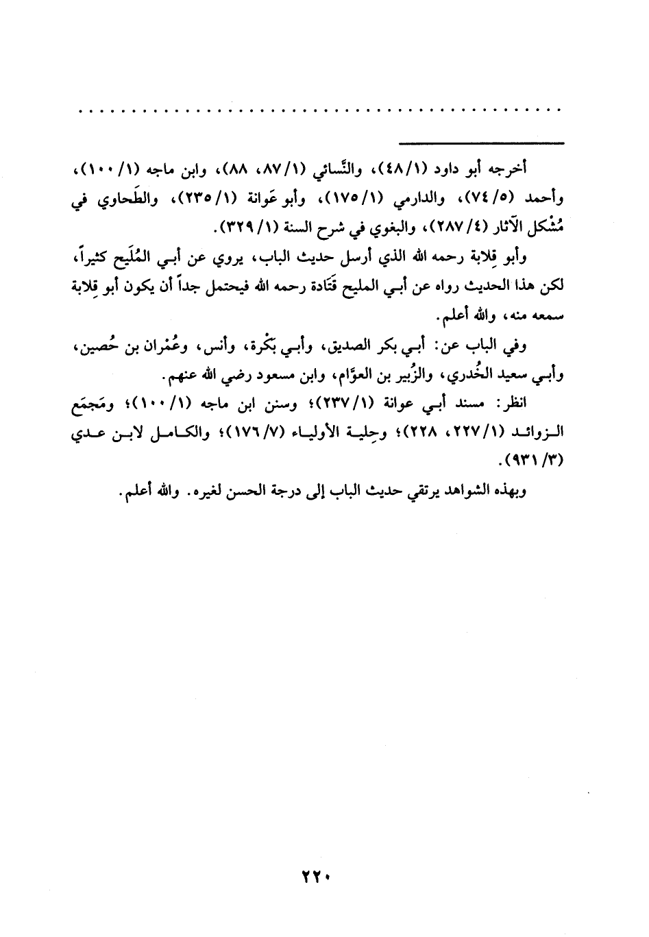= أخرجه أبو داود (1/ 48)، والنَّسائي (1/ 87، 88)، وابن ماجه (1/ 100)، وأحمد (5/ 74)، والدارمي (1/ 175)، وأبو عَوانة (1/ 235)، والطَحاوي في مُشكل الآثار (4/ 287)، والبغوي في شرح السنة (1/ 329).