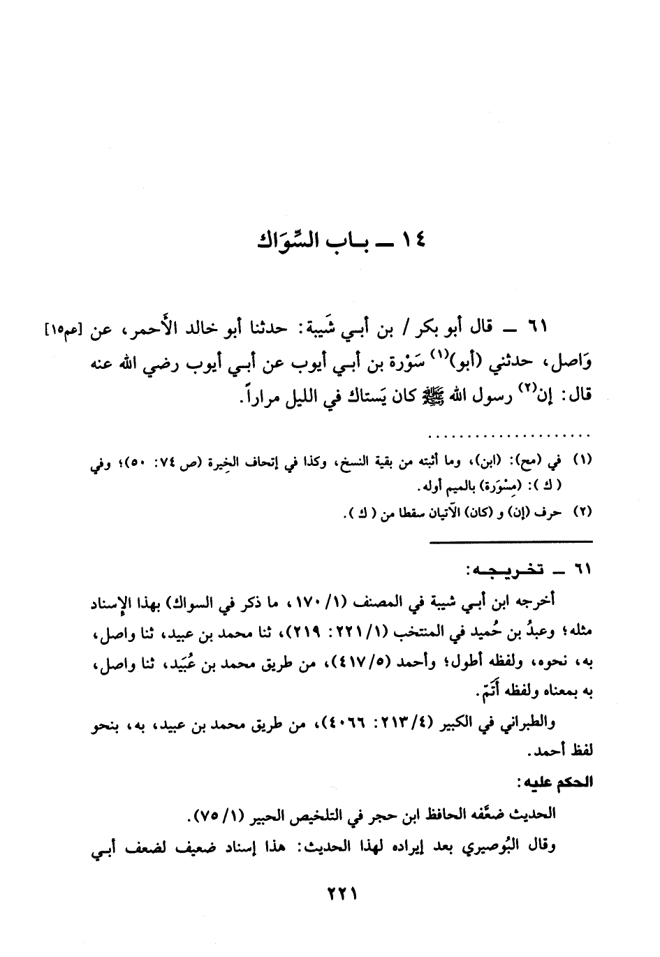 حدثنا أبو خال الْأَحْمَرُ، عَنْ وَاصِلٍ، حَدَّثَنِي (أَبُو) سَوْرَةَ بن أَبِي أَيُّوبَ عَنْ أَبِي أَيُّوبَ رَضِيَ اللَّهُ عَنْهُ قَالَ: إِنَّ رَسُولَ اللَّهِ صَلَّى اللَّهُ عَلَيْهِ وَسَلَّمَ كَانَ §يَسْتَاكُ فِي اللَّيْلِ مِرَارًا