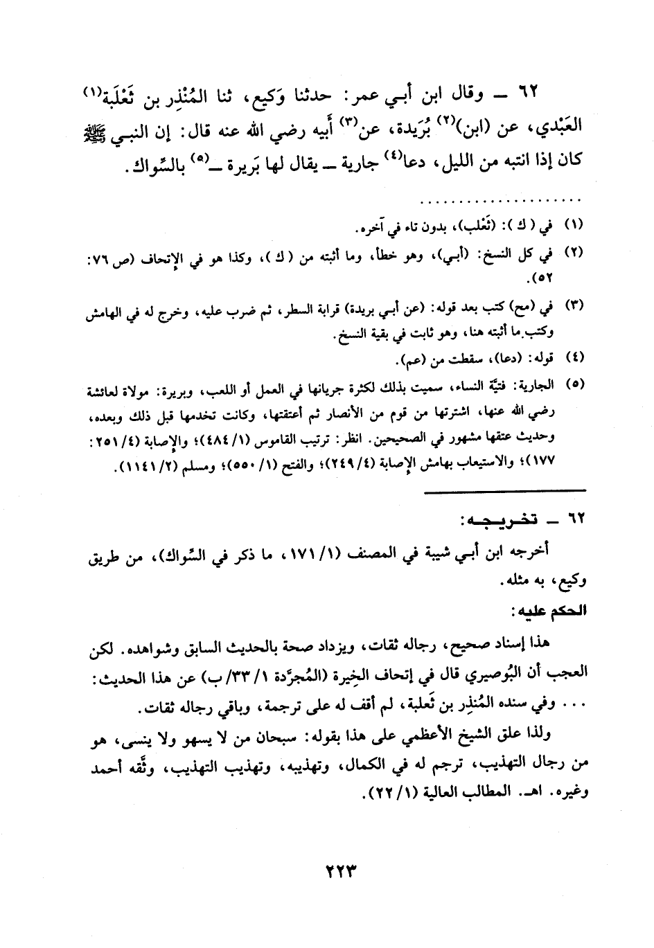 حَدَّثَنَا وَكِيعٌ، ثنا الْمُنْذِرُ بْنُ ثَعْلَبَةَ الْعَبْدِيُّ، عَنِ (ابْنِ) بُرَيْدَةَ عَنْ أَبِيهِ رَضِيَ اللَّهُ عَنْهُ قَالَ: إِنَّ النَّبِيَّ صَلَّى اللَّهُ عَلَيْهِ وَسَلَّمَ كَانَ §إِذَا انْتَبَهَ مِنَ اللَّيْلِ، دَعَا جَارِيَةً - يُقَالُ لَهَا بَرْيَرَةُ - بِالسِّوَاكِ
