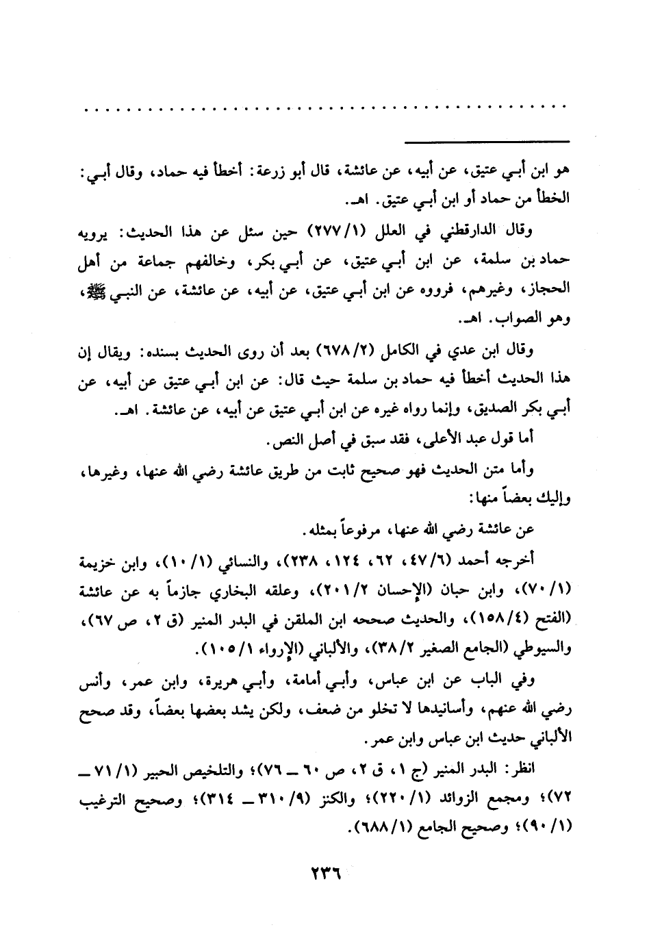 وقال الدارقطني في العلل (1/ 277) حين سئل عن هذا الحديث: يرويه حماد بن سلمة، عن ابن أبي عتيق، عن أبي بكر، وخالفهم جماعة من أهل الحجاز، وغيرهم، فرووه عَنِ ابْنِ أَبِي عَتِيقٍ، عَنْ أَبِيهِ، عَنْ عائشة، عن النبي - صلى الله عليه وسلم -، وهو الصواب. اهـ.