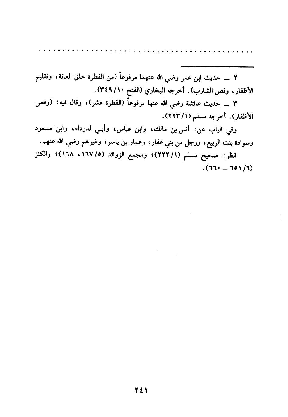 3 - حديث عائشة رضي الله عنها مرفوعًا (الفطرة عشر)، وقال فيه: (وقص الأظفار). أخرجه مسلم (1/ 223).