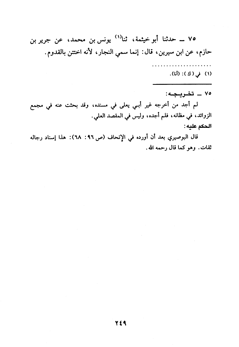 75 - حَدَّثَنَا أَبُو خَيْثَمَةَ، ثنا يُونُسُ بْنُ مُحَمَّدٍ، عَنْ جَرِيرِ بْنِ حَازِمٍ، عَنِ ابْنِ سِيرِينَ، قَالَ: إِنَّمَا §سُمِّيَ النَّجَّارَ، لِأَنَّهُ اخْتَتَنَ بِالْقَدُومِ