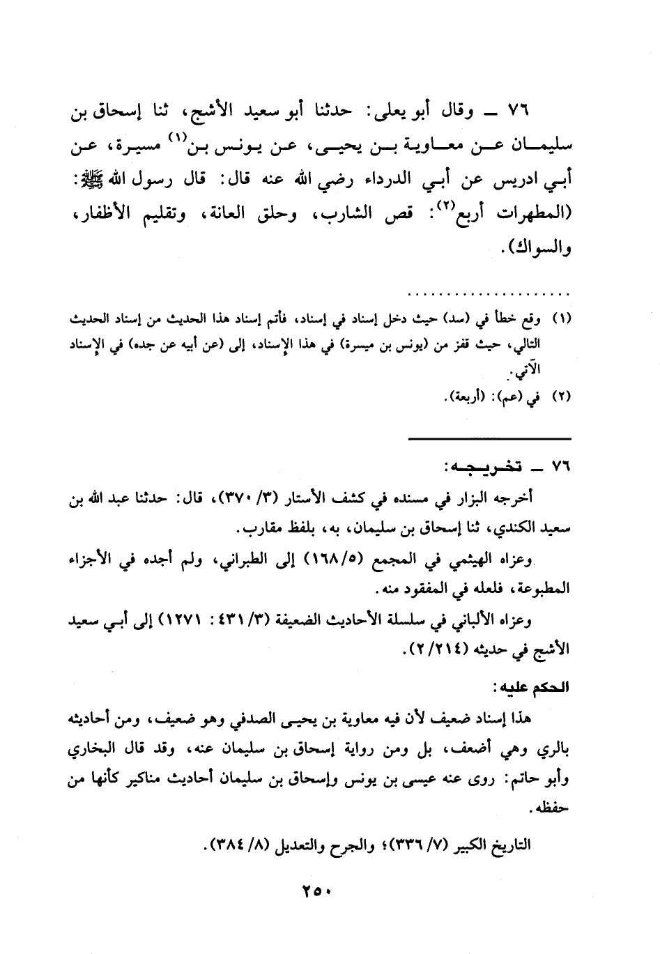 حَدَّثَنَا أَبُو سَعِيدٍ الْأَشَجُّ، ثنا إِسْحَاقُ بْنُ سُلَيْمَانَ عَنْ مُعَاوِيَةَ بْنِ يَحْيَى، عَنْ يُونُسَ بْنِ مسيرة، عَنْ أَبِي إِدْرِيسَ عَنْ أَبِي الدَّرْدَاءِ رَضِيَ اللَّهُ عَنْهُ قَالَ: قَالَ رَسُولُ اللَّهِ صَلَّى اللَّهُ عَلَيْهِ وَسَلَّمَ (§الْمُطَهِّرَاتُ أَرْبَعٌ: قَصُّ الشَّارِبِ، وَحَلْقُ الْعَانَةِ، وَتَقْلِيمُ الْأَظْفَارِ، وَالسِّوَاكُ)