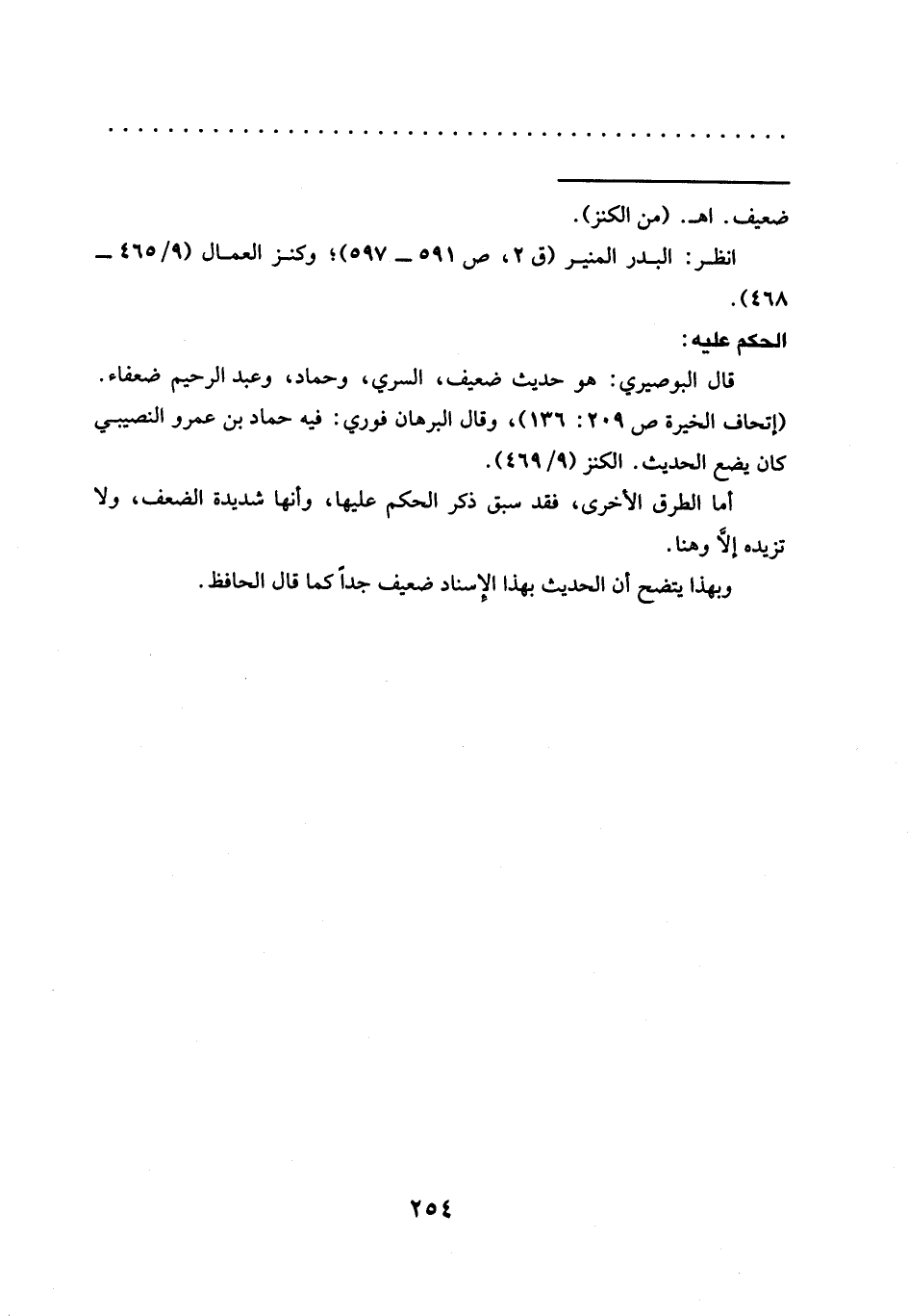 (إتحاف الخيرة ص 209: 136)، وقال البرهان فوري: فيه حماد بن عمرو النصيبي كان يضع الحديث. الكنز (9/ 469).