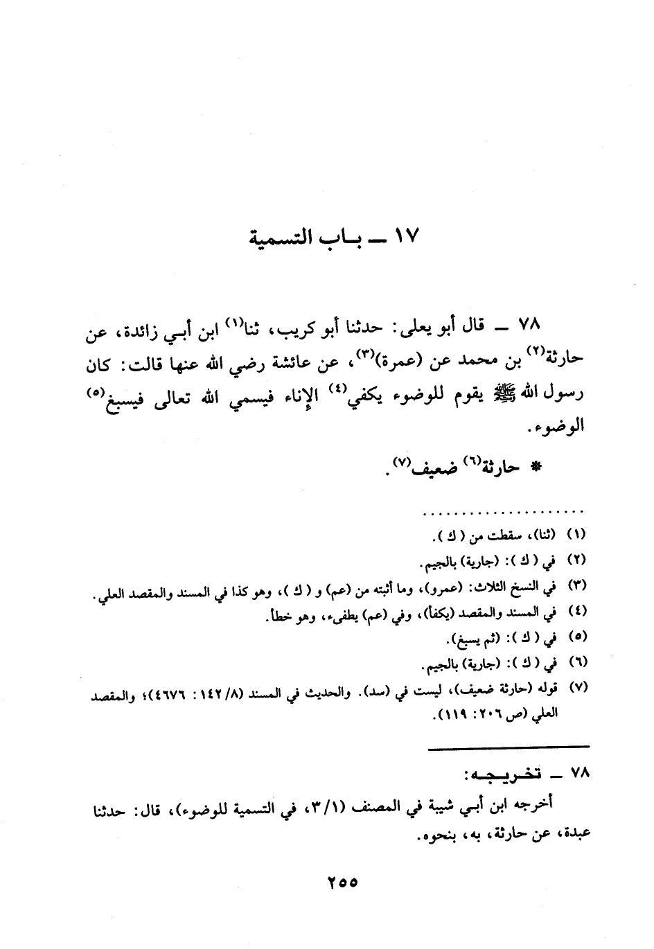 حَدَّثَنَا أَبُو كُرَيْبٍ، ثنا ابْنُ أَبِي زَائِدَةَ، عَنْ حَارِثَةَ بْنِ مُحَمَّدٍ عَنْ (عَمْرَةَ) ، عَنْ عَائِشَةَ رَضِيَ اللَّهُ عَنْهَا قَالَتْ: كَانَ رَسُولُ اللَّهِ صَلَّى اللَّهُ عَلَيْهِ وَسَلَّمَ §يَقُومُ لِلْوُضُوءِ يكفي الْإِنَاءَ فَيُسَمِّي اللَّهَ تَعَالَى فيسيغ الْوُضُوءَ