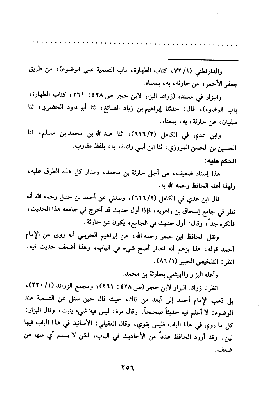 انظر: زوائد البزار لابن حجر (ص 428: 261)؛ ومجمع الزوائد (1/ 220)، بل ذهب الإمام أحمد إلى أبعد من ذاك، حيث قال حين سئل عن التسمية عند الوضوء: لا أعلم فيه حديثًا صحيحًا. وقال مرة: ليس فيه شيء يثبت، وقال البزار: كل ما روي في هذا الباب فليس بقوي، وقال العقيلي: الأسانيد في هذا الباب فيها لين. وقد أورد الحافظ عددًا من الأحاديث في الباب، لكن لا يسلم أي منها من ضعف.=