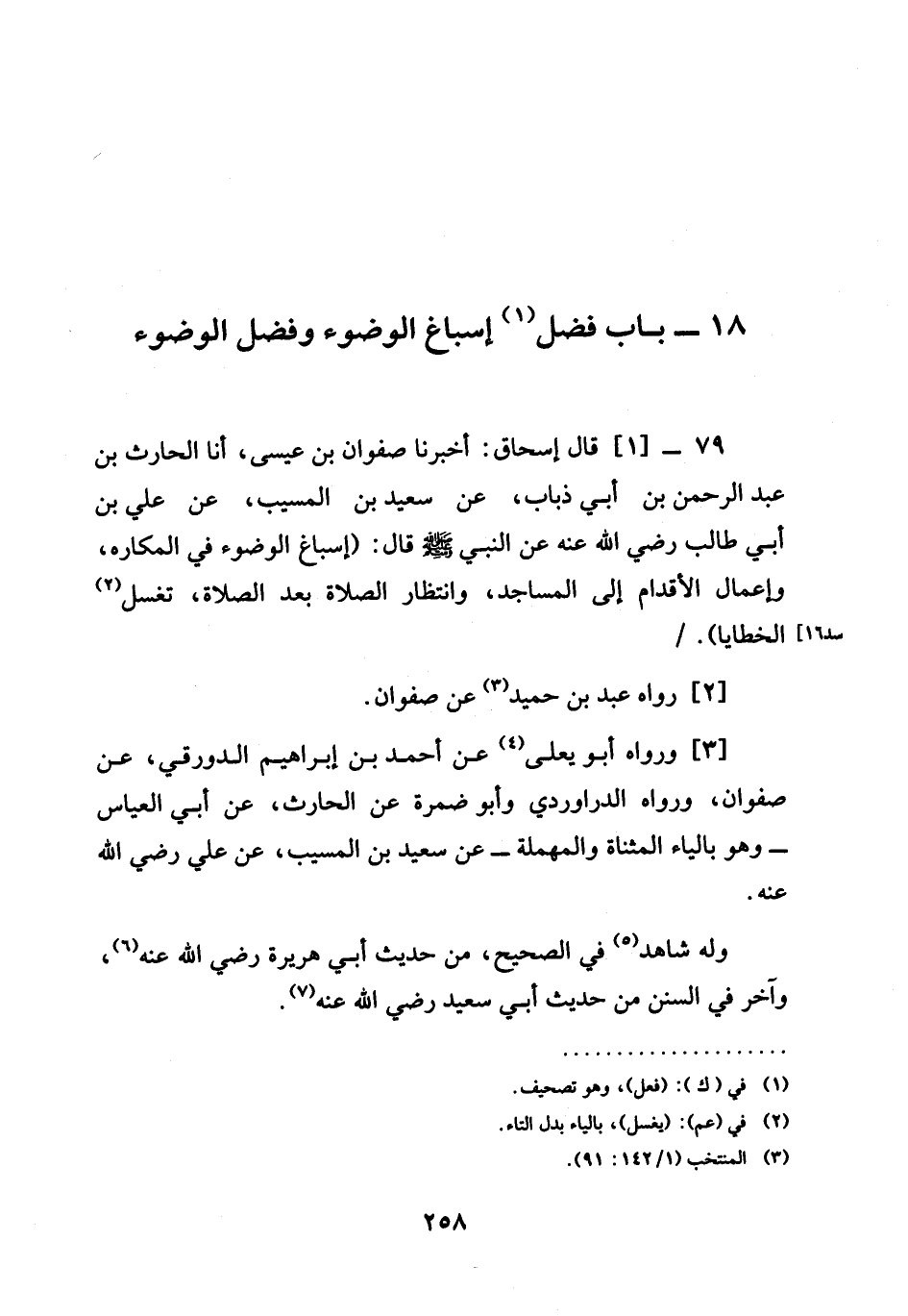 أَخْبَرَنَا صَفْوَانُ بْنُ عِيسَى، أنا الْحَارِثُ بْنُ عَبْدِ الرَّحْمَنِ بْنِ أَبِي ذُبَابٍ، عَنْ سَعِيدِ بْنِ الْمُسَيِّبِ، عنْ عَلِيِّ بْنِ أَبِي طَالِبٍ رَضِيَ اللَّهُ عَنْهُ عَنِ النَّبِيِّ صَلَّى اللَّهُ عَلَيْهِ وَسَلَّمَ قَالَ: (§إِسْبَاغُ الْوُضُوءِ فِي الْمَكَارِهِ، وَإِعْمَالُ الْأَقْدَامِ إِلَى الْمَسَاجِدِ، وَانْتِظَارُ الصَّلَاةِ بَعْدَ الصَّلَاةِ، تَغْسِلُ الْخَطَايَا) /