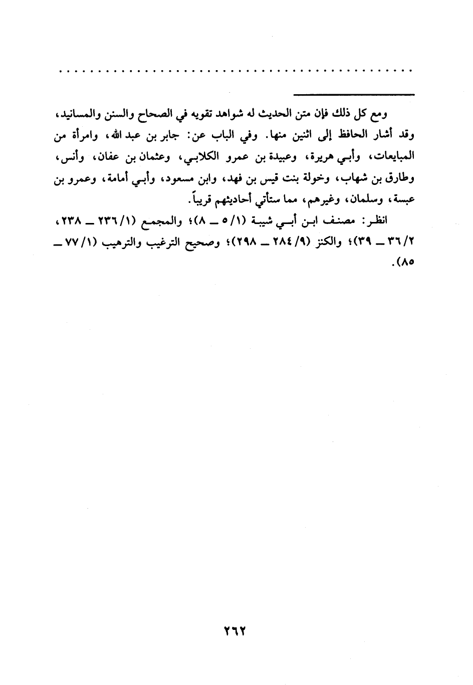 = ومع كل ذلك فإن متن الحديث له شواهد تقويه في الصحاح والسنن والمسانيد، وقد أشار الحافظ إلى اثنين منها. وفي الباب عن: جابر بن عبد الله، وامرأة من المبايعات، وأبي هريرة، وعبيدة بن عمرو الكلابي، وعثمان بن عفان، وأنس، وطارق بن شهاب، وخولة بنت قيس بن فهد، وابن مسعود، وأبي أمامة، وعمرو بن عبسة، وسلمان، وغيرهم، مما ستأتي أحاديثهم قريبًا.