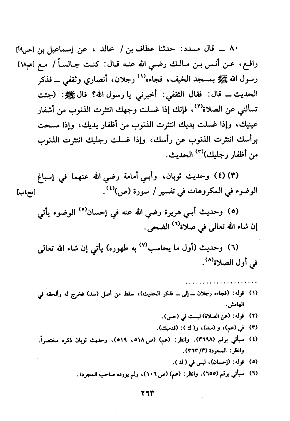 حَدَّثَنَا عَطَّافُ بْنُ / خَالِدٍ، عَنْ إِسْمَاعِيلَ بْنِ رَافِعٍ عَنْ أَنَسِ بْنِ مَالِكٍ رَضِيَ اللَّهُ عَنْهُ قَالَ: كُنْتُ جَالِسًا / مَعَ رَسُولِ اللَّهِ صَلَّى اللَّهُ عَلَيْهِ وَسَلَّمَ بِمَسْجِدِ الْخَيْفِ، فَجَاءَهُ رَجُلَانِ، أَنْصَارِيٌّ وَثَقَفِيٌّ - فَذَكَرَ الْحَدِيثَ - قَالَ: فَقَالَ الثَّقَفِيُّ: أَخْبِرْنِي يَا رَسُولَ اللَّهِ؟ قَالَ: صَلَّى اللَّهُ عَلَيْهِ وَسَلَّمَ: (جِئْتَ تَسْأَلُنِي عَنِ الصَّلَاةِ، فَإِنَّكَ §إِذَا غَسَلْتَ وَجْهَكَ انْتَثَرَتِ الذُّنُوبُ مِنْ أَشْفَارِ عَيْنَيْكَ وَإِذَا غَسَلْتَ يَدَيْكَ انتشرت الذُّنُوبُ مِنْ أَظْفَارِ يَدَيْكَ، وَإِذَا مَسَحْتَ بِرَأْسِكَ انْتَثَرَتِ الذُّنُوبُ عَنْ رَأْسِكَ، وَإِذَا غَسَلْتَ رِجْلَيْكَ انْتَثَرَتِ الذُّنُوبُ مِنْ أَظْفَارِ رِجْلَيْكَ) الْحَدِيثَ
