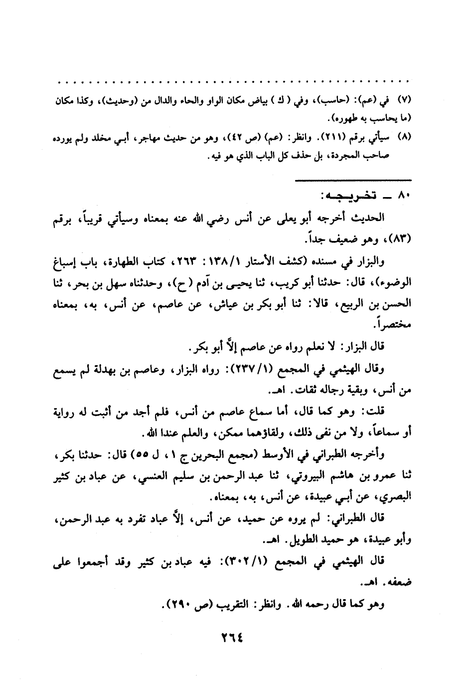 وأخرجه الطبراني في الأوسط (مجمع البحرين ج 1، ل 55) فال: حدثنا بكر، ثنا عمرو بن هاشم البيروتي، ثنا عبد الرحمن بن سليم العنسي، عن عباد بن كثبر البصري، عن أبي عبيدة، عن أنس، به، بمعناه.