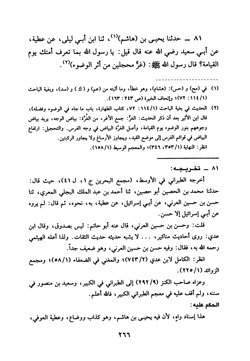 81 - حَدَّثَنَا يَحْيَى بْنُ (هَاشِمٍ) ، ثنا ابْنُ أَبِي لَيْلَى، عَنْ عَطِيَّةَ، عَنْ أَبِي سَعِيدٍ رَضِيَ اللَّهُ عَنْهُ قَالَ قِيلَ: يَا رَسُولَ اللَّهِ بِمَا تَعْرِفُ أُمَّتَكَ يَوْمَ الْقِيَامَةِ؟ قَالَ رسول الله صَلَّى اللَّهُ عَلَيْهِ وَسَلَّمَ (§غرٌّ مُحَجَّلِينَ مِنْ أَثَرِ الْوُضُوءِ)