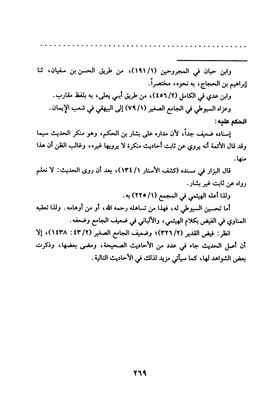 انظر: فيض القدير (2/ 326)؛ وضعيف الجامع الصغير (2/ 43: 1438)، إلا أن أصل الحديث جاء في عدد من الأحاديث الصحيحة، ومضى بعضها، وذكرت بعض الشواهد لها، كما سيأتي مزيد لذلك في الأحاديث التالية.
