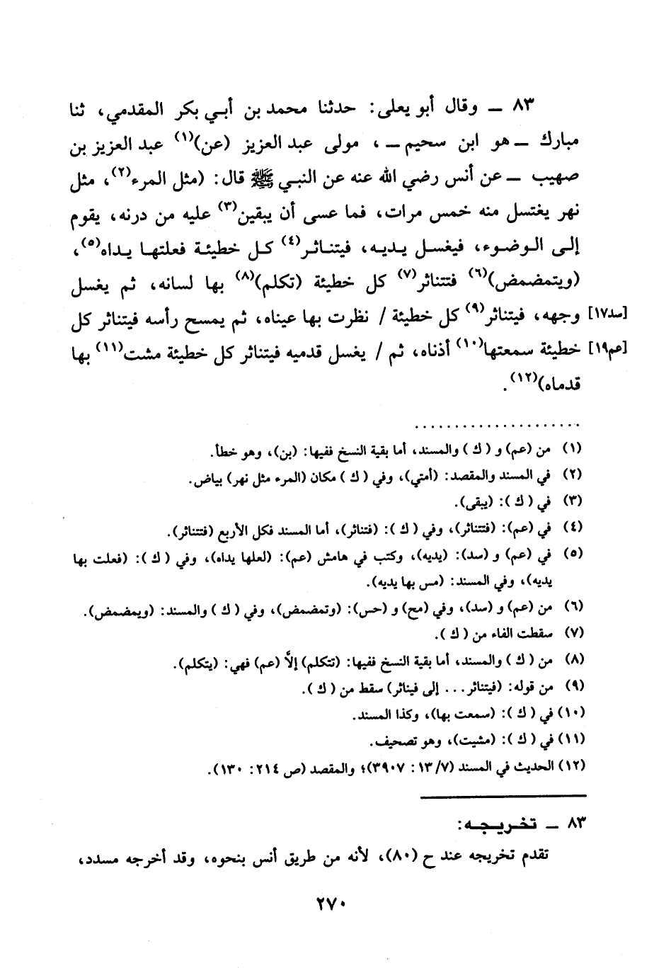 حَدَّثَنَا مُحَمَّدُ بْنُ أَبِي بَكْرٍ الْمُقَدَّمِيُّ، ثنا مُبَارَكٌ - هُوَ ابْنُ سُحَيْمٍ -، مَوْلَى عَبْدِ العزيز (عن) عبدا لعزيز بْنِ صُهَيْبٍ - عَنْ أَنَسٍ رَضِيَ اللَّهُ عَنْهُ عَنِ النَّبِيِّ صَلَّى اللَّهُ عَلَيْهِ وَسَلَّمَ قَالَ: (§مَثَلُ الْمَرْءِ، مَثَلُ نَهَرٍ يُغْتَسَلُ مِنْهُ خَمْسَ مَرَّاتٍ، فَمَا عَسَى أَنْ يَبْقَيَنَّ عَلَيْهِ مِنْ دَرَنِهِ يَقُومُ إِلَى الْوُضُوءِ، فَيَغْسِلُ يَدَيْهِ، فَيَتَنَاثَرُ كُلُّ خَطِيئَةٍ فَعَلَتْهَا يَدَاهُ، (وَيَتَمَضْمَضُ) فَتَتَنَاثَرُ كُلُّ خَطِيئَةٍ (تَكَلَّمَ) بِهَا لِسَانُهُ، ثُمَّ يَغْسِلُ وَجْهَهُ، فَيَتَنَاثَرُ كُلُّ خَطِيئَةٍ / نَظَرَتْ بِهَا عَيْنَاهُ، ثُمَّ يَمْسَحُ رَأْسَهُ فَيَتَنَاثَرُ كُلُّ خَطِيئَةٍ سَمِعَتْهَا أُذُنَاهُ، ثُمَّ / يَغْسِلُ قَدَمَيْهِ فَيَتَنَاثَرُ كُلُّ خَطِيئَةٍ مَشَتْ بِهَا قَدَمَاهُ)