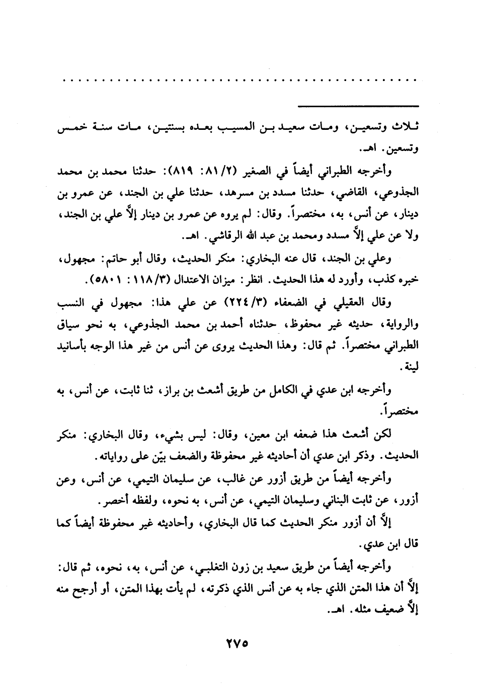 إلَّا أن هذا المتن الذي جاء به عن أنس الذي ذكرته، لم يأت بهذا المتن، أو أرجح منه إلَّا ضعيف مثله. اهـ.=