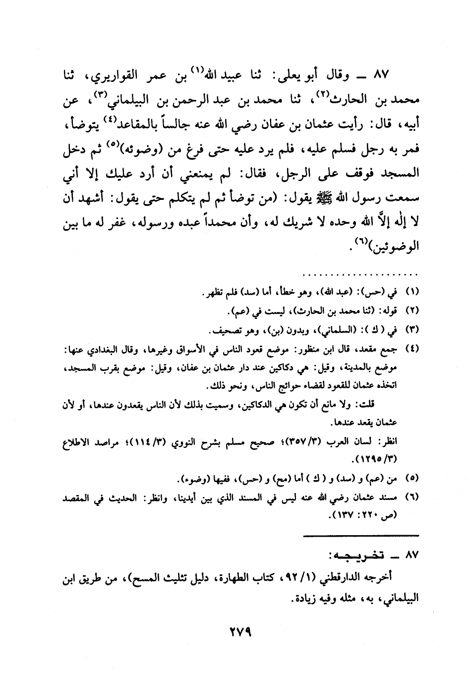 87 - وَقَالَ أَبُو يَعْلَى: ثنا عُبَيْدُ اللَّهِ بْنُ عُمَرَ الْقَوَارِيرِيُّ، ثنا مُحَمَّدُ بْنُ الْحَارِثِ، ثنا مُحَمَّدُ بْنُ عَبْدِ الرَّحْمَنِ بْنُ الْبَيْلَمَانِيِّ، عَنْ أَبِيهِ، قَالَ: رَأَيْتُ عُثْمَانَ بْنَ عَفَّانَ رَضِيَ اللَّهُ عَنْهُ جَالِسًا بِالْمَقَاعِدِ يَتَوَضَّأُ، فَمَرَّ بِهِ رَجُلٌ فَسَلَّمَ عَلَيْهِ، فَلَمْ يَرُدَّ عَلَيْهِ حَتَّى فَرَغَ مِنْ (وَضُوئِهِ) ثُمَّ دَخَلَ الْمَسْجِدَ فَوَقَفَ عَلَى الرَّجُلِ، فَقَالَ: لَمْ يَمْنَعْنِي أَنْ أَرُدَّ عَلَيْكَ إِلَّا أَنِّي سَمِعْتُ رَسُولَ اللَّهِ صَلَّى اللَّهُ عَلَيْهِ وَسَلَّمَ يَقُولُ: (§مَنْ تَوَضَّأَ ثُمَّ لَمْ يَتَكَلَّمْ حَتَّى يَقُولَ: أَشْهَدُ أَنْ لَا إِلَهَ إِلَّا اللَّهُ وَحْدَهُ لَا شَرِيكَ لَهُ، وَأَنَّ مُحَمَّدًا عَبْدُهُ وَرَسُولُهُ، غُفِرَ لَهُ مَا بَيْنَ الوضوئين)