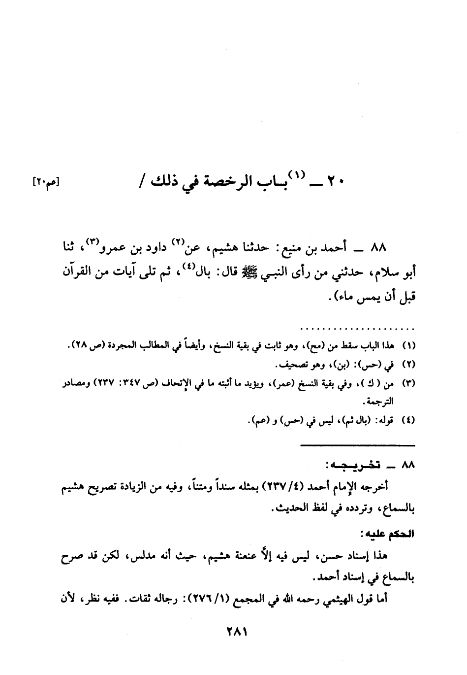 حَدَّثَنَا هُشَيْمٌ، عَنْ دَاوُدَ بْنِ عَمْرٍو، ثنا أَبُو سَلَّامٍ، حَدَّثَنِي مَنْ رَأَى النَّبِيَّ صَلَّى اللَّهُ عَلَيْهِ وَسَلَّمَ §قَالَ: بال، ثم تلى آيَاتٍ مِنَ الْقُرْآنِ قَبْلَ أن يمس ماء)