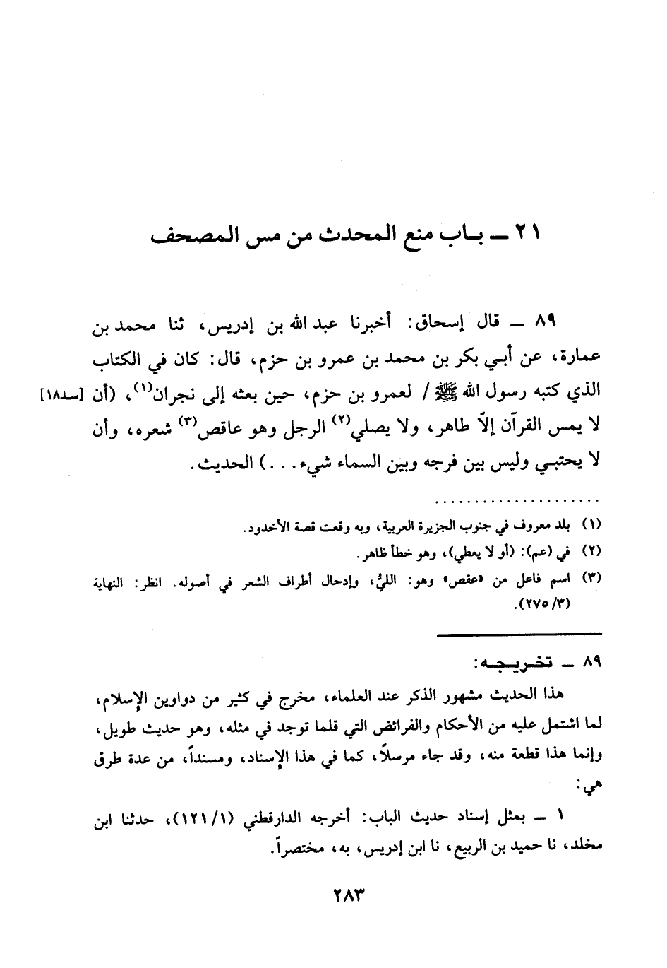 أَخْبَرَنَا عَبْدُ اللَّهِ بْنُ إِدْرِيسَ، ثنا مُحَمَّدُ بْنُ عُمَارَةَ، عَنْ أَبِي بَكْرِ بْنِ مُحَمَّدِ بْنِ عَمْرِو بْنِ حَزْمٍ، قَالَ: كَانَ فِي الْكِتَابِ الَّذِي كَتَبَهُ رَسُولُ اللَّهِ صَلَّى اللَّهُ عَلَيْهِ وَسَلَّمَ / لَعَمْرِو بْنِ حَزْمٍ، حِينَ بَعَثَهُ إِلَى نجران، أن §لا يَمَسَّ الْقُرْآنَ إِلَّا طَاهِرٌ، وَلَا يُصَلِّيَ الرَّجُلُ وَهُوَ عاقص شعره، وأن لا يَحْتَبِيَ وَلَيْسَ بَيْنَ فَرْجِهِ وَبَيْنَ السَّمَاءِ شَيْءٌ) الْحَدِيثَ