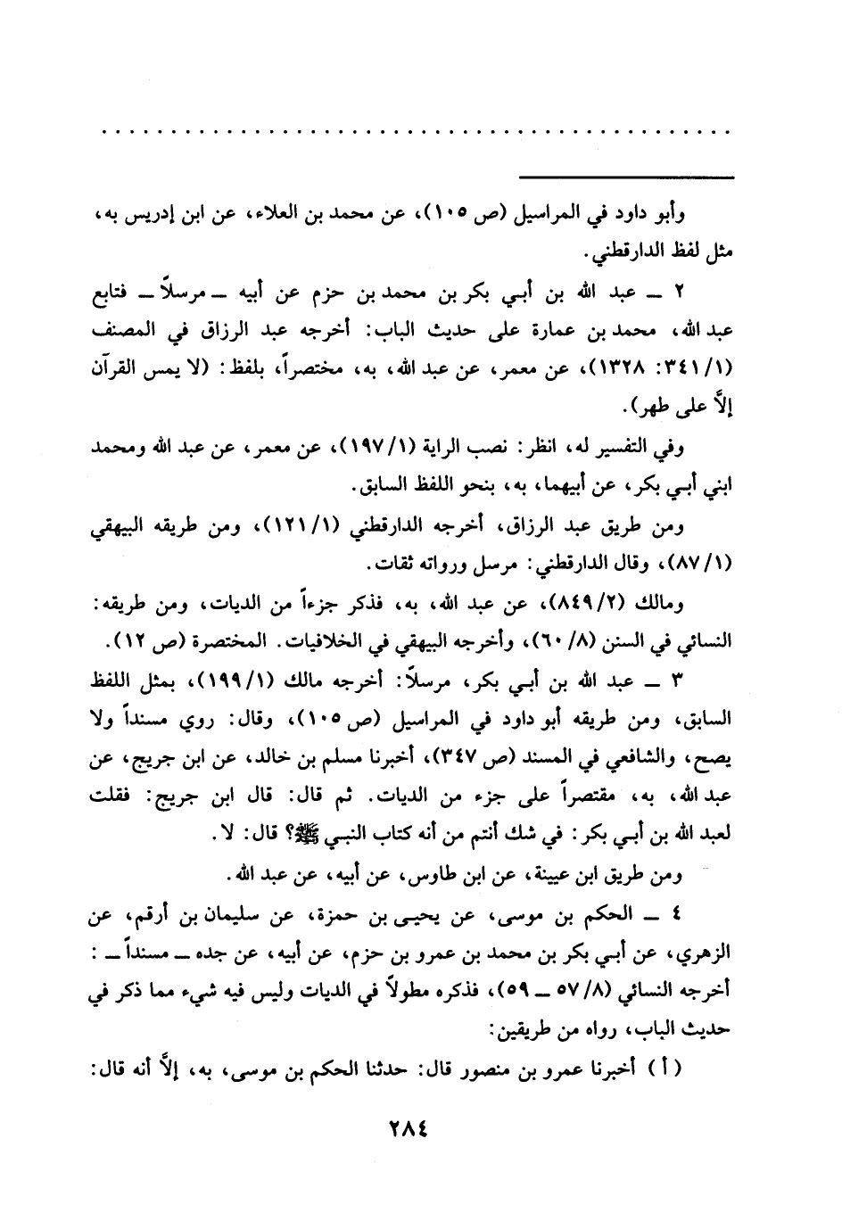 3 - عبد الله بن أبي بكر، مرسلًا: أخرجه مالك (1/ 199)، بمثل اللفظ السابق، ومن طريقه أبو داود في المراسيل (ص 105)، وقال: روي مسندًا ولا يصح، والشافعي في المسند (ص 347)، أخبرنا مسلم بن خالد، عن ابن جريج، عن عبد الله، به، مقتصرًا على جزء من الديات. ثم قال: قال ابن جريج: فقلت لعبد الله بن أبي بكر: في شك أنتم من أنه كتاب النبي - صلى الله عليه وسلم -؟ قال: لا.