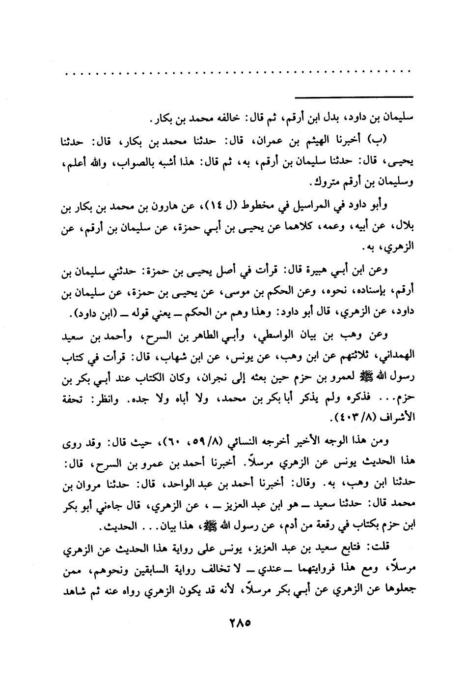 وعن وهب بن بيان الواسطي، وأبي الطاهر بن السرح، وأحمد بن سعيد الهمداني، ثلاثتهم عن ابن وهب، عن يونس، عن ابن شهاب، قال: قرأت في كِتَابُ رَسُولِ اللَّهِ - صَلَّى اللَّهُ عَلَيْهِ وَسَلَّمَ - لعمرو بن حزم حين بعثه إلى نجران، وكان الكتاب عند أبي بكر بن حزم ... فذكره ولم يذكر أبا بكر بن محمد، ولا أباه ولا جده. وانظر: تحفة الأشراف (8/ 403).