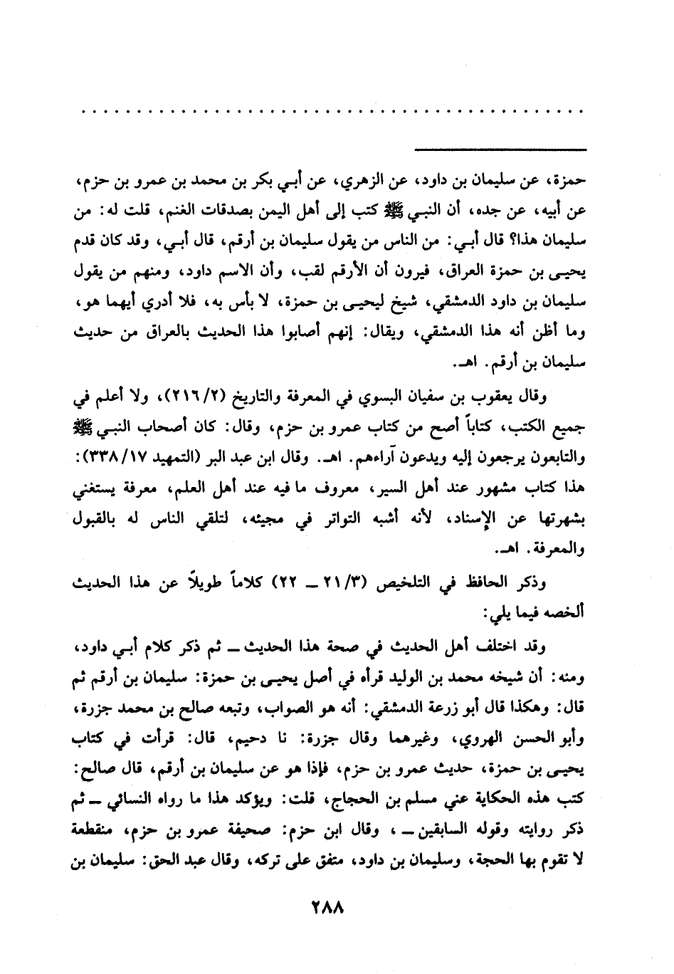 = حمزة، عن سليمان بن داود، عن الزهري، عَنْ أَبِي بَكْرِ بْنِ مُحَمَّدِ بْنِ عَمْرِو بن حزم، عن أبيه، عَنْ جَدِّهِ، أَنَّ النَّبِيَّ - صَلَّى اللَّهُ عَلَيْهِ وسلم - كتب إلى أهل اليمن بصدقات الغنم، قلت له: من سليمان هذا؟ قال أبي: من الناس من يقول سليمان بن أرقم، قال أبي، وقد كان قدم يحيى بن حمزة العراق، فيرون أن الأرقم لقب، وأن الاسم داود، ومنهم من يقول سليمان بن داود الدمشقي، شيخ ليحيى بن حمزة، لا بأس به، فلا أدري أيهما هو، وما أظن أنه هذا الدمشقي، ويقال: إنهم أصابوا هذا الحديث بالعراق من حديث سليمان بن أرقم. اهـ،