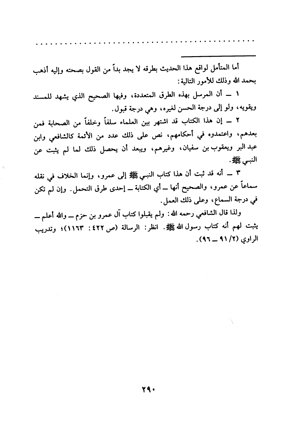 ولذا قال الشافعي رحمه الله: ولم يقبلوا كتاب آل عمرو بن حزم -والله أعلم- يثبت لهم أنه كِتَابُ رَسُولِ اللَّهِ - صَلَّى اللَّهُ عَلَيْهِ وَسَلَّمَ -. انظر: الرسالة (ص 422: 1163)؛ وتدريب الراوي (2/ 91 - 96).