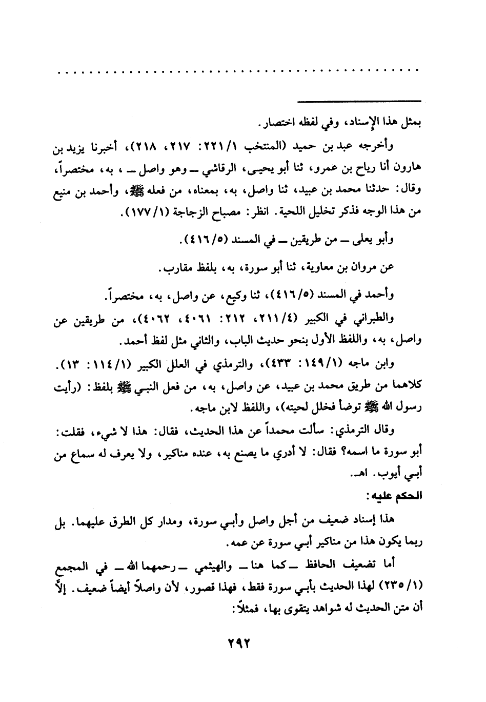 كلاهما من طريق محمد بن عبيد، عن واصل، به، من فعل النبي - صلى الله عليه وسلم - بِلَفْظِ: (رَأَيْتُ رَسُولَ اللَّهِ - صَلَّى اللَّهُ عَلَيْهِ وَسَلَّمَ - توضأ فخلل لحيته)، واللفظ لابن ماجه.