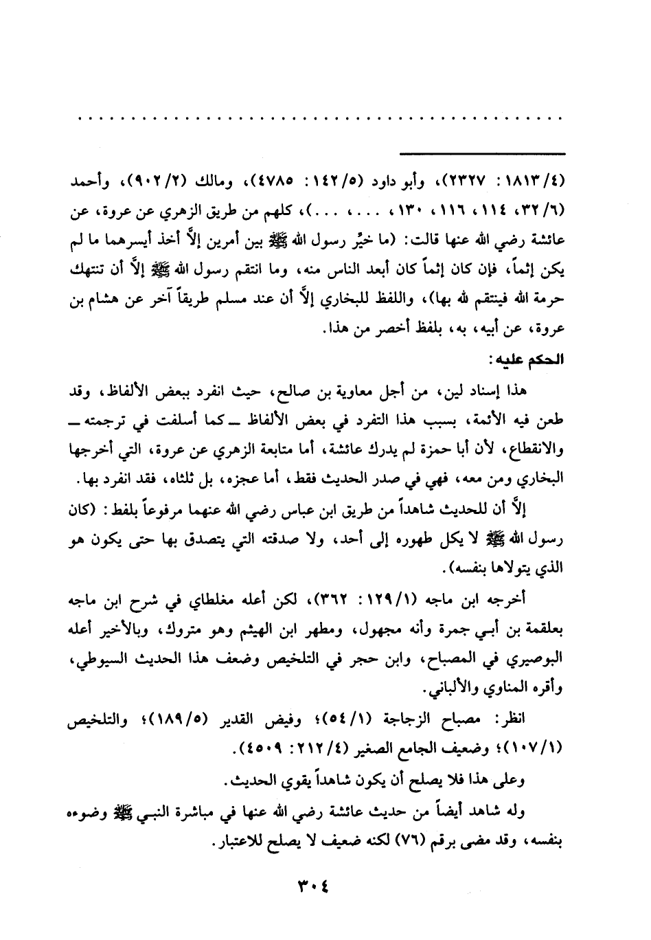 هذا إسناد لين، من أجل معاوية بن صالح، حيث انفرد ببعض الألفاظ، وقد طعن فيه الأئمة، بسبب هذا التفرد في بعض الألفاظ -كما أسلفت في ترجمته- والانقطاع، لأن أبا حمزة لم يدرك عائشة، أما متابعة الزهري عن عروة، التي أخرجها البخاري ومن معه، فهي في صدر الحديث فقط، أما عجزه، بل ثلثاه، فقد انفرد بها.